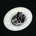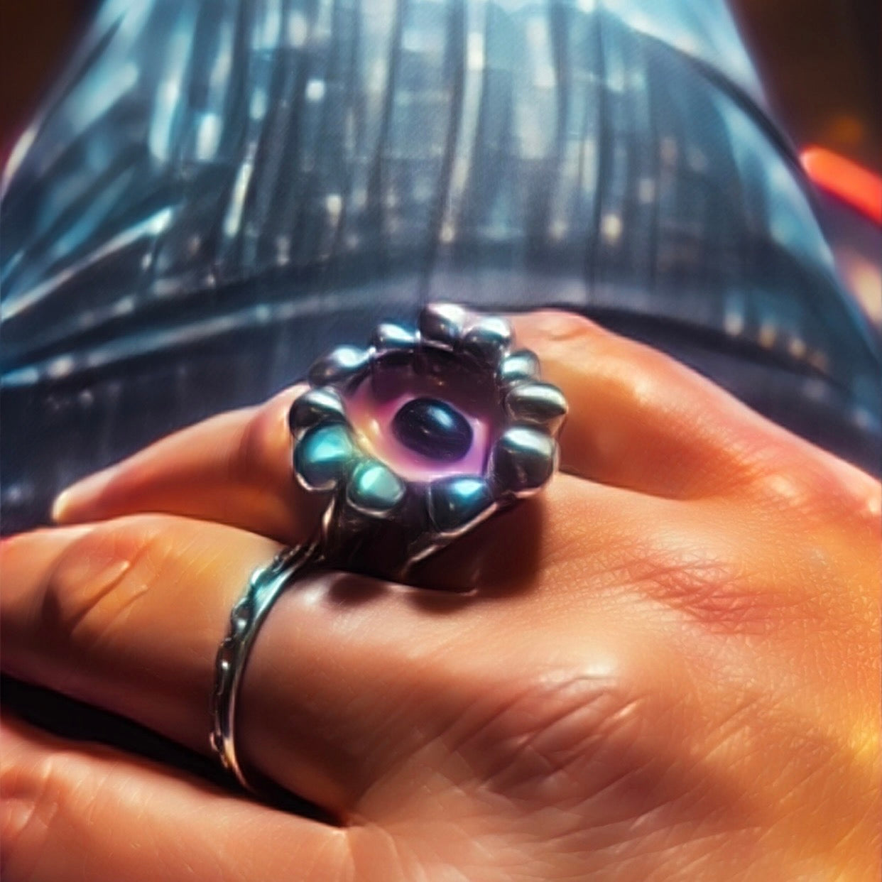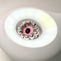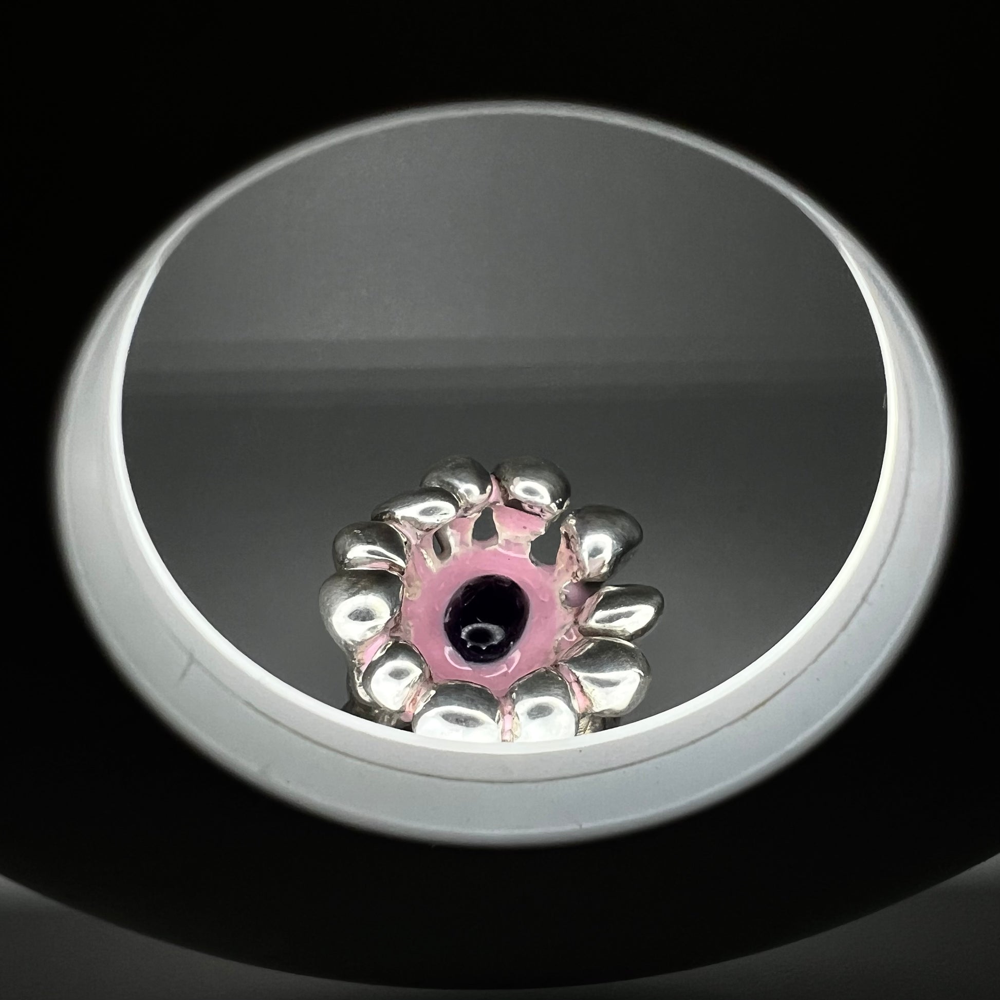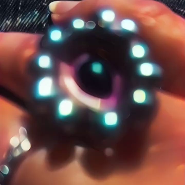 La pierre est délicatement sertie dans une résine rose, qui en souligne la profondeur tout en apportant une touche de modernité et de douceur.