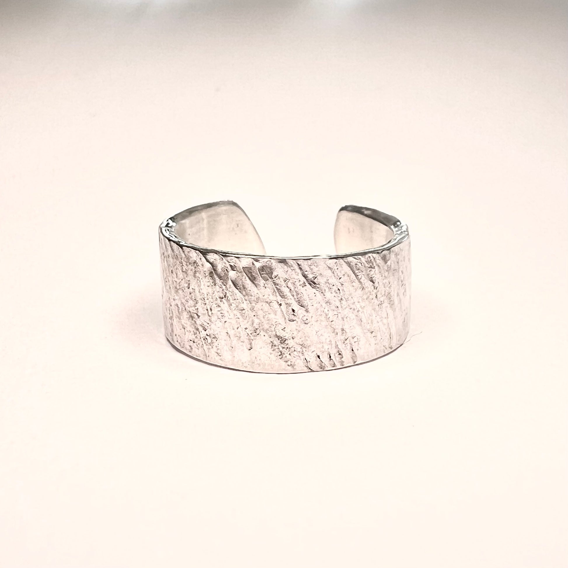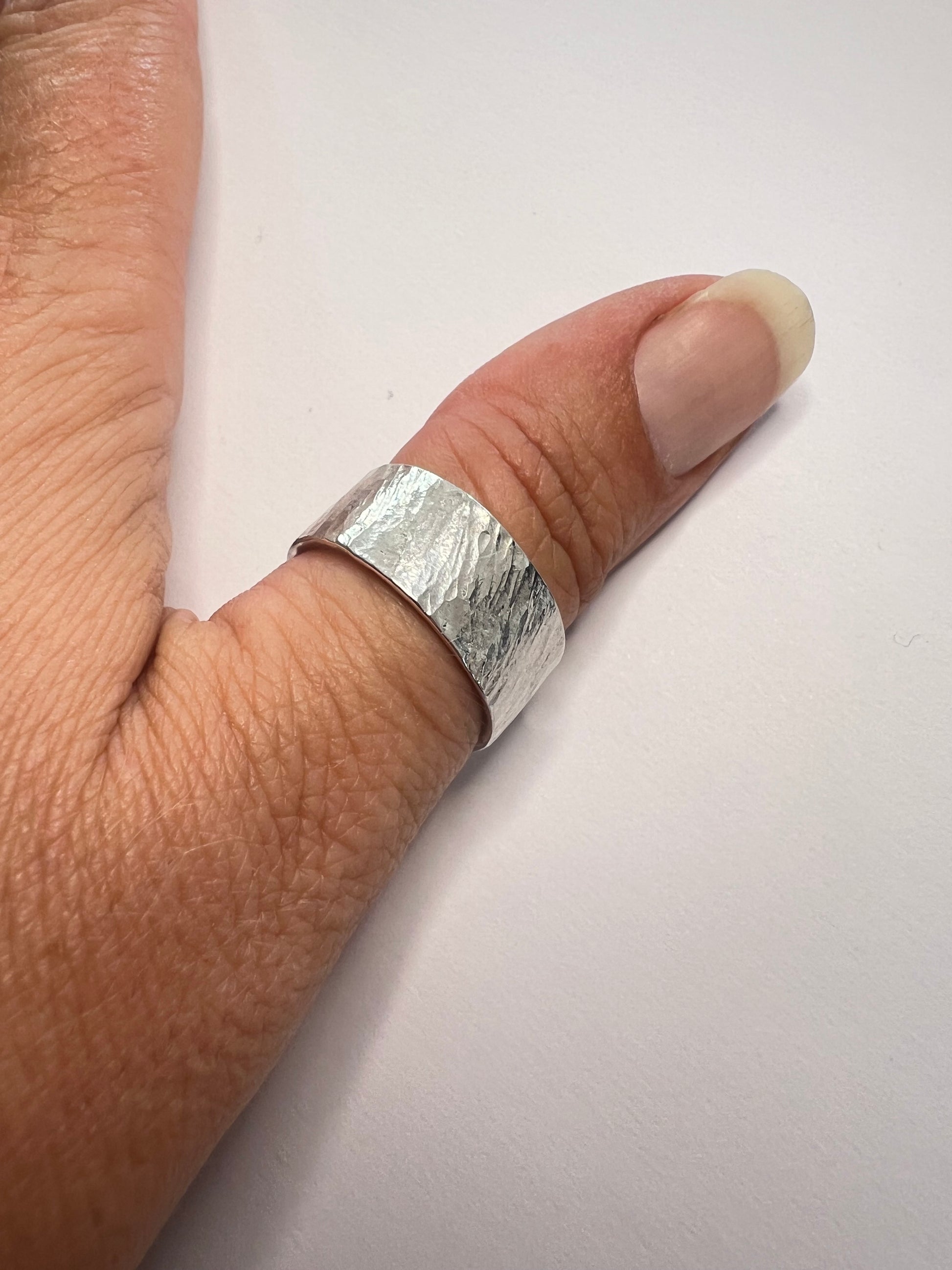 Entièrement façonnée à la main, cette bague en argent massif 925/1000 séduit par son design brut et authentique. Son martelage irrégulier capte la lumière et confère à chaque pièce un caractère unique, reflet du savoir-faire artisanal.
