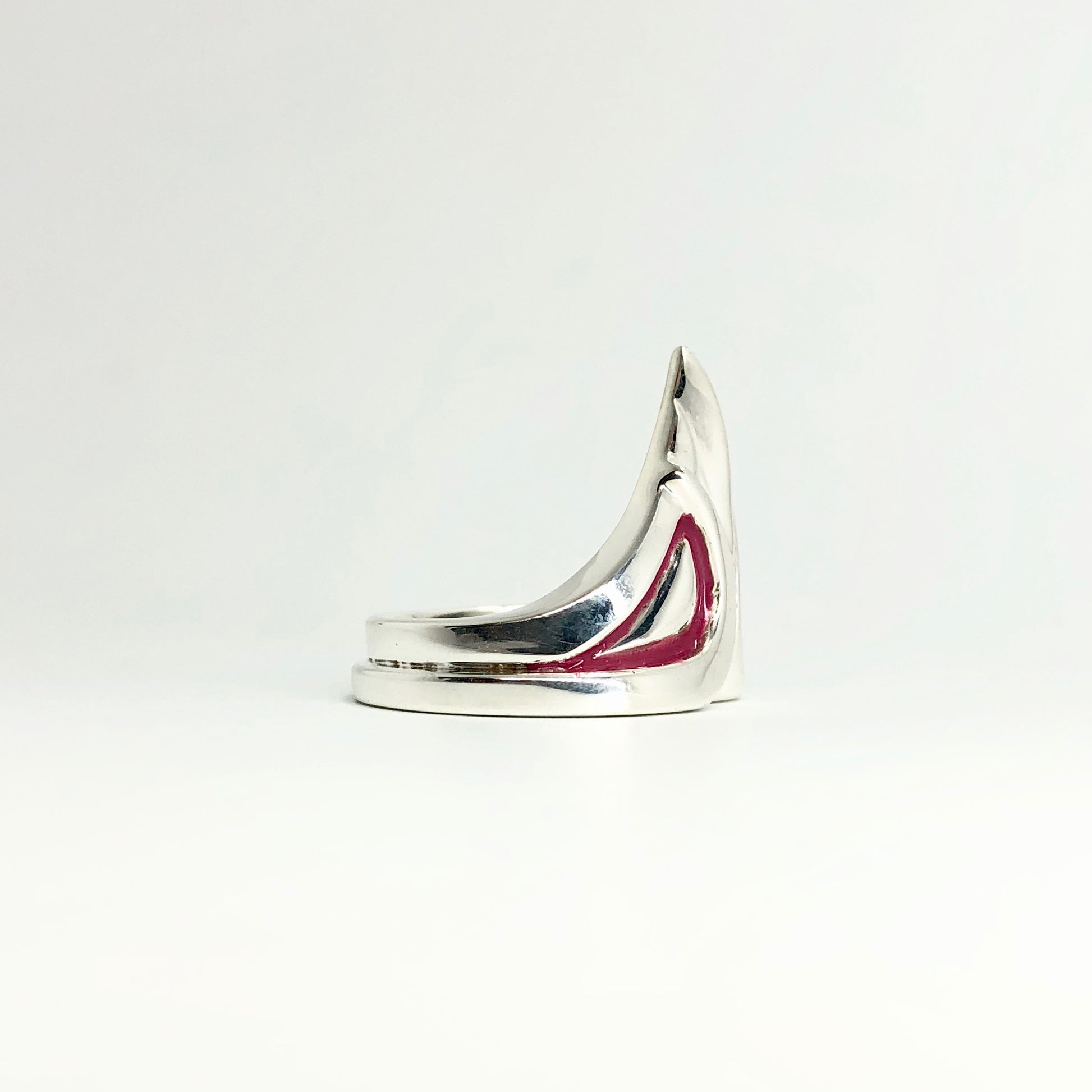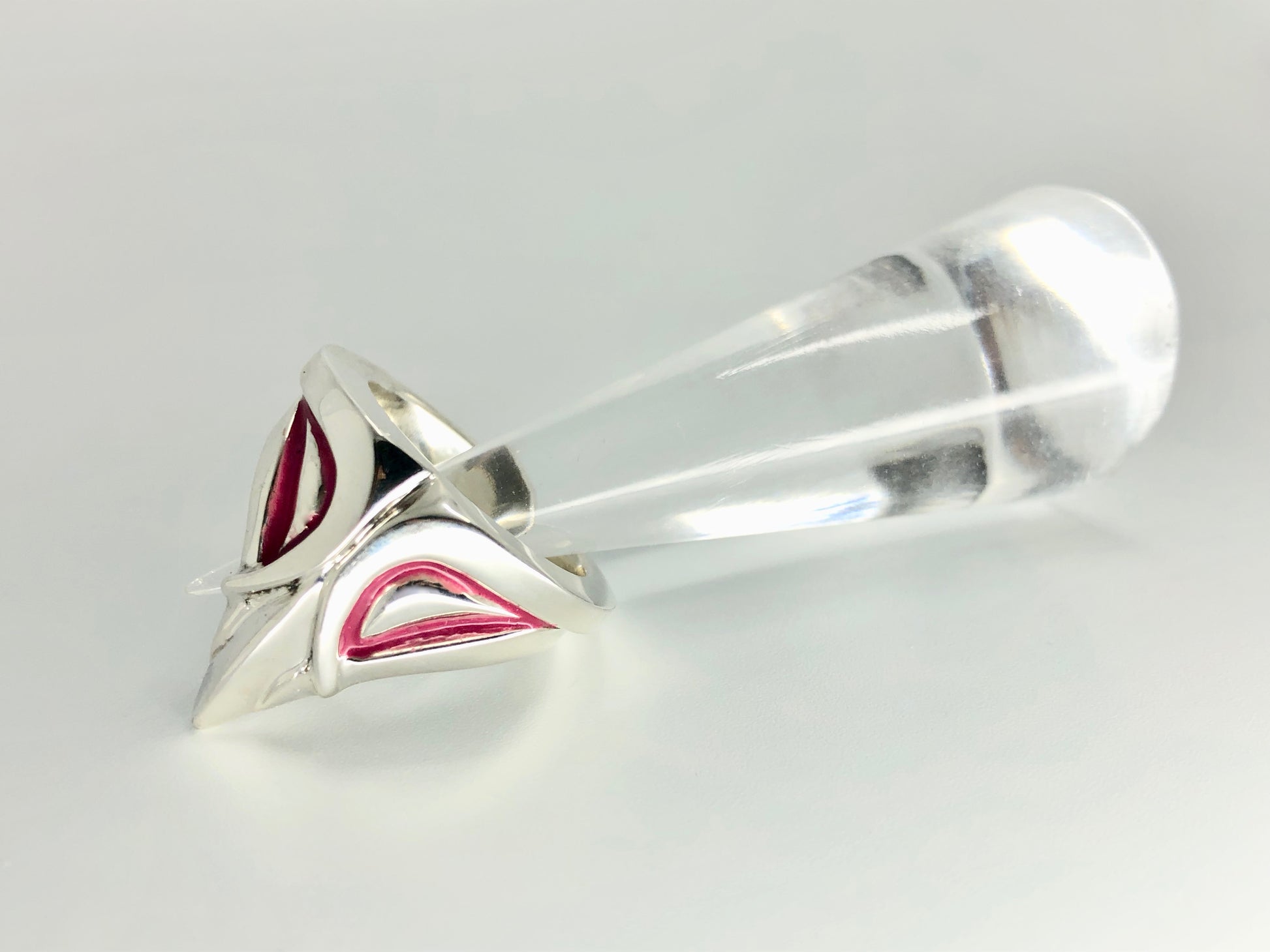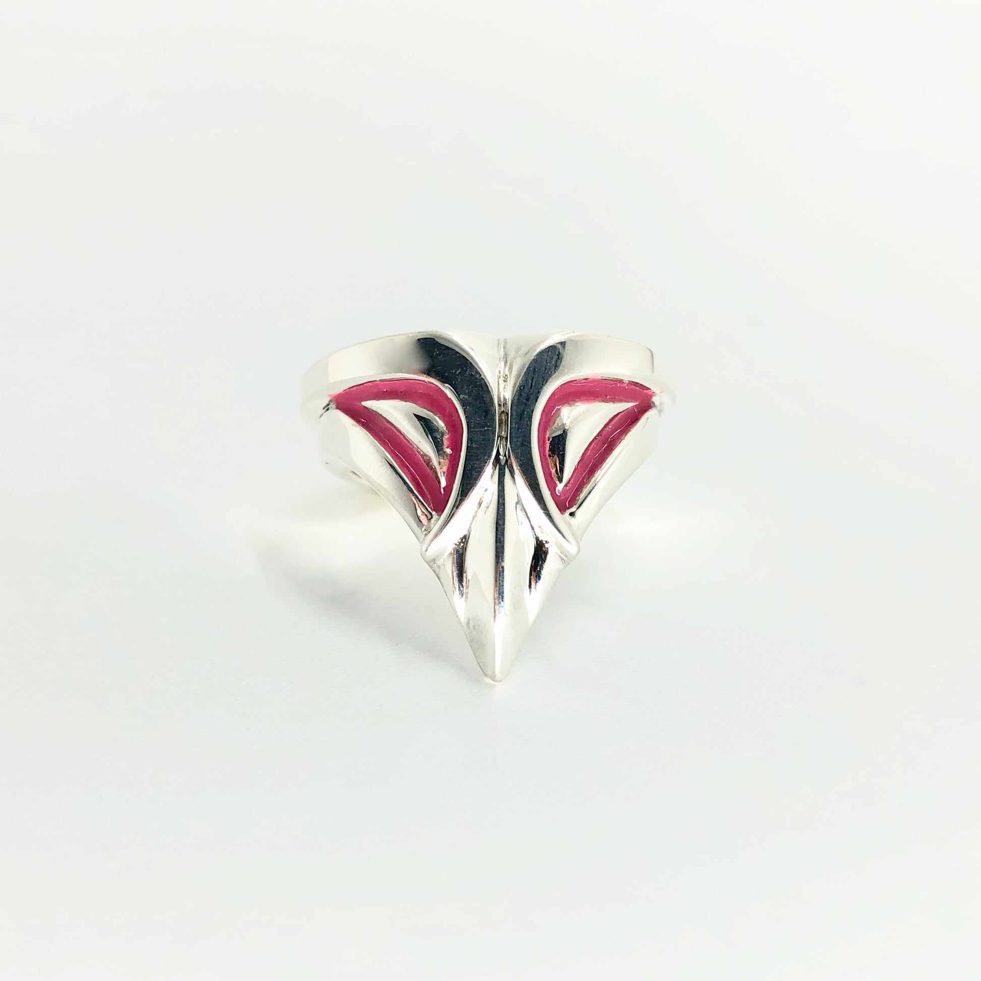Apportez une touche originale à votre look avec cette bague masque en argent massif, ornée d’un contour des yeux en émail à froid rose