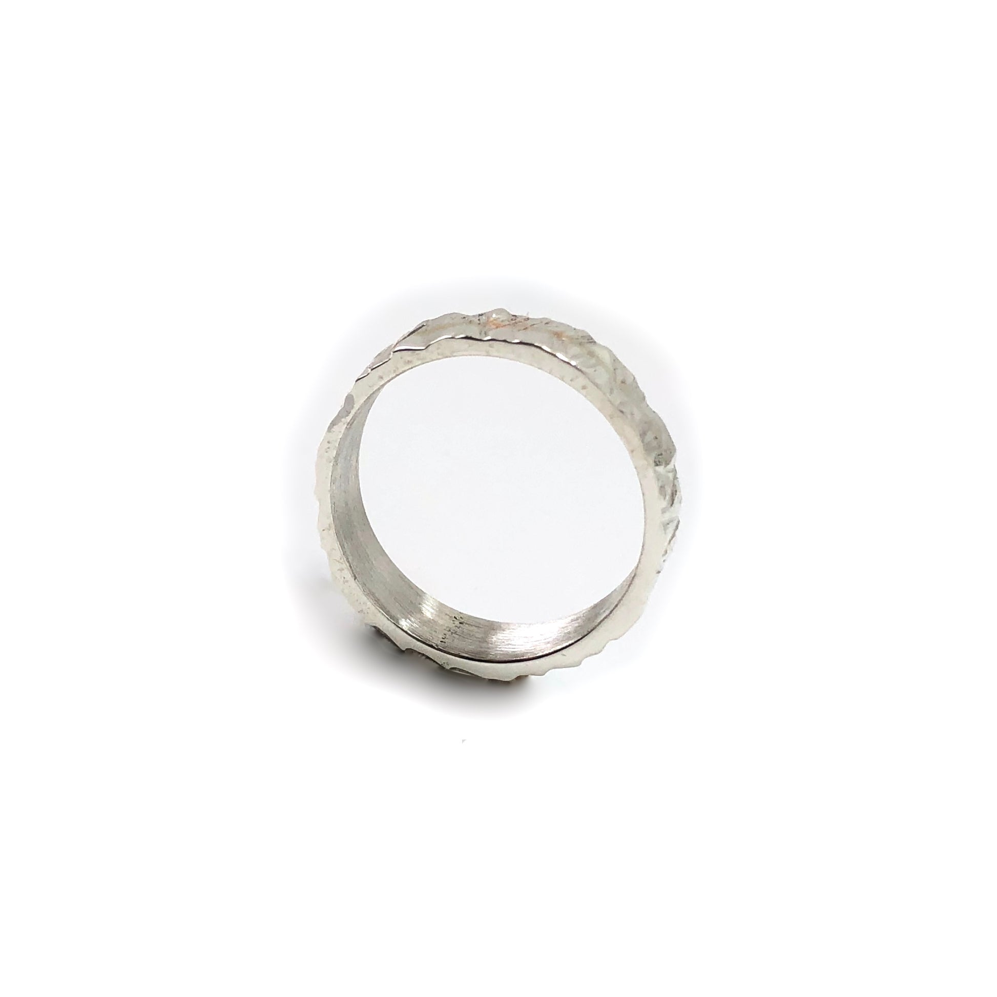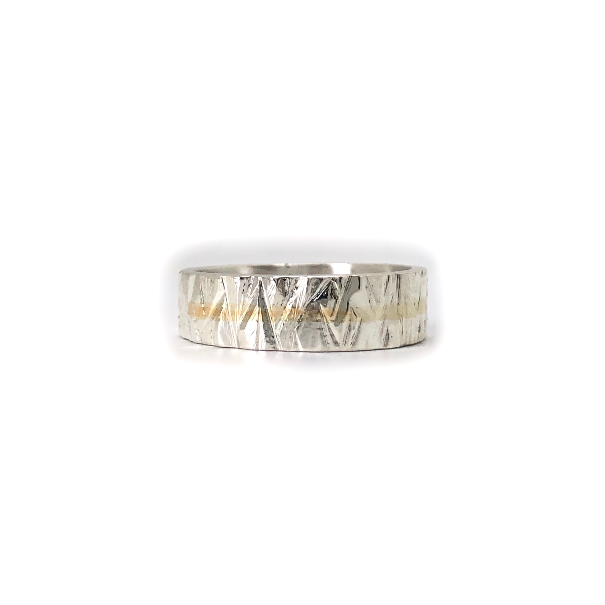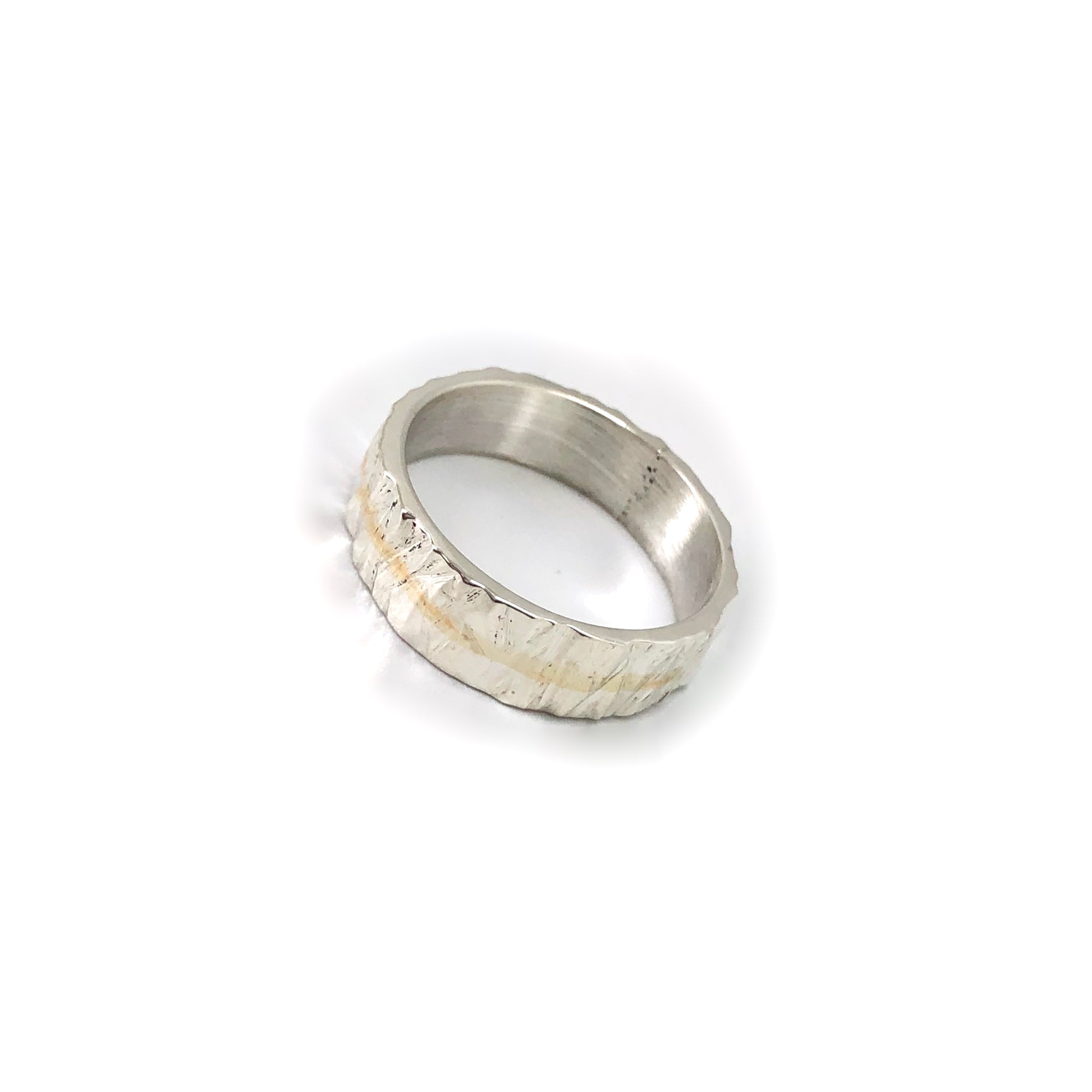 Une fine ligne centrale, délicatement tracée sur une moitié de l’anneau, souligne son caractère à la fois brut et raffiné.