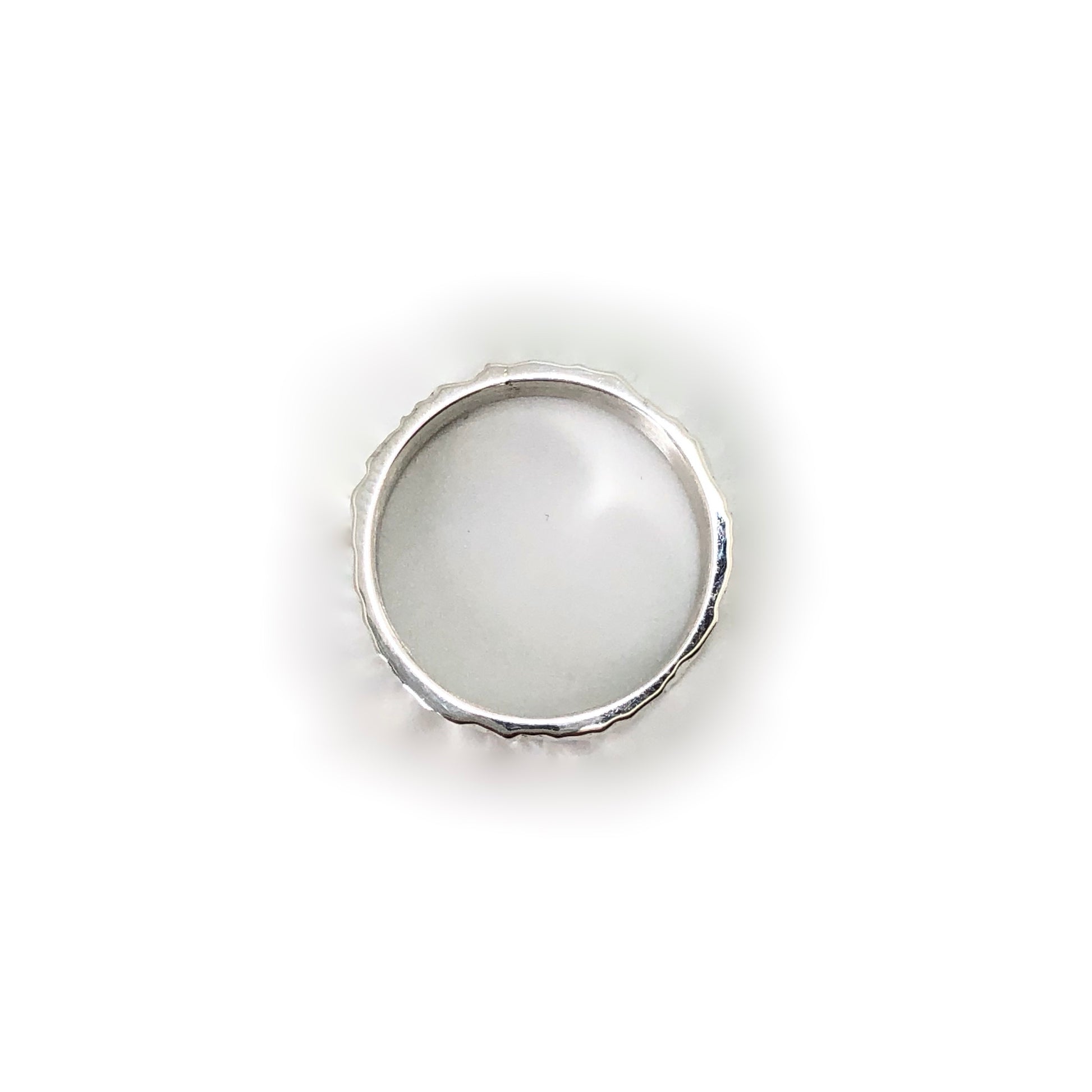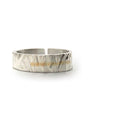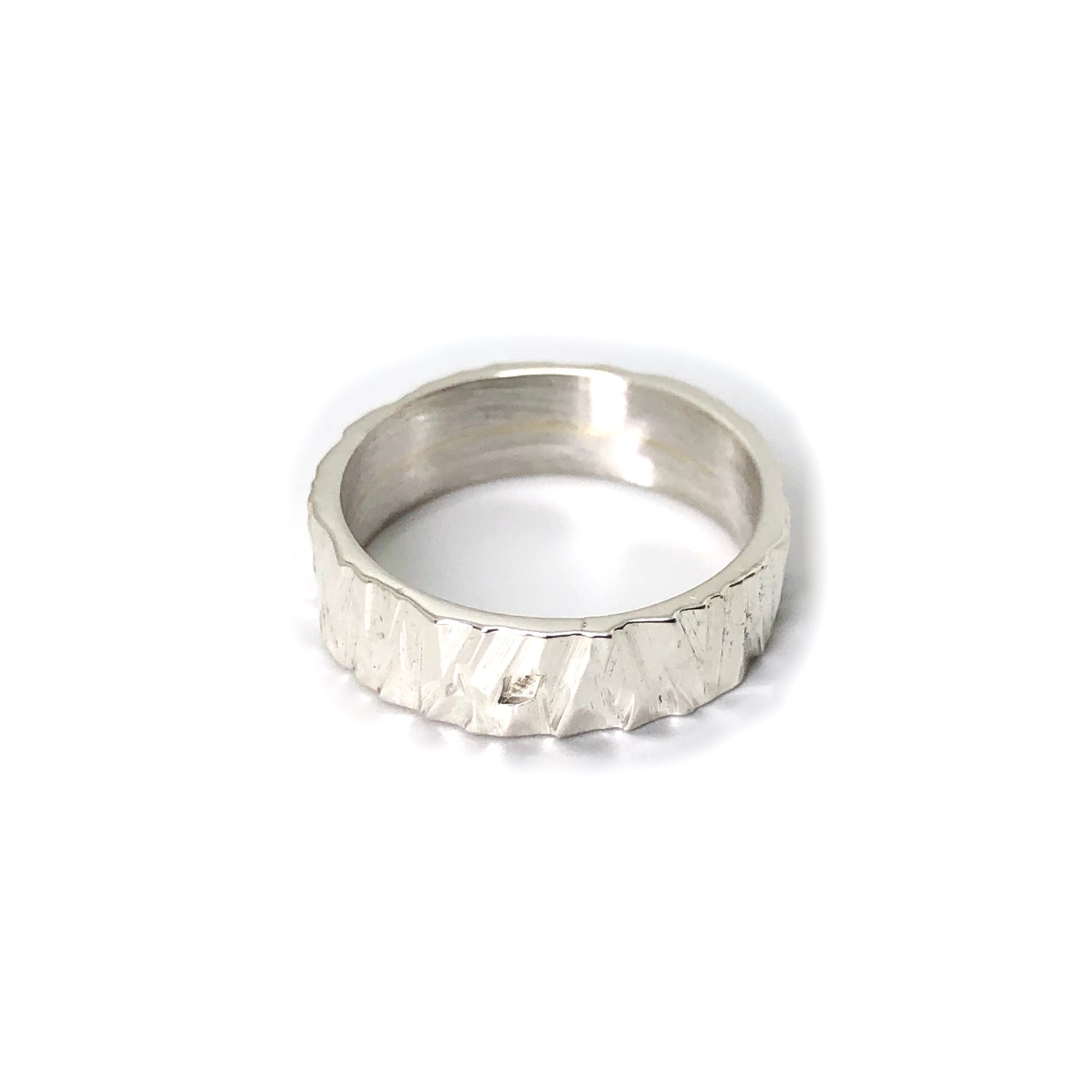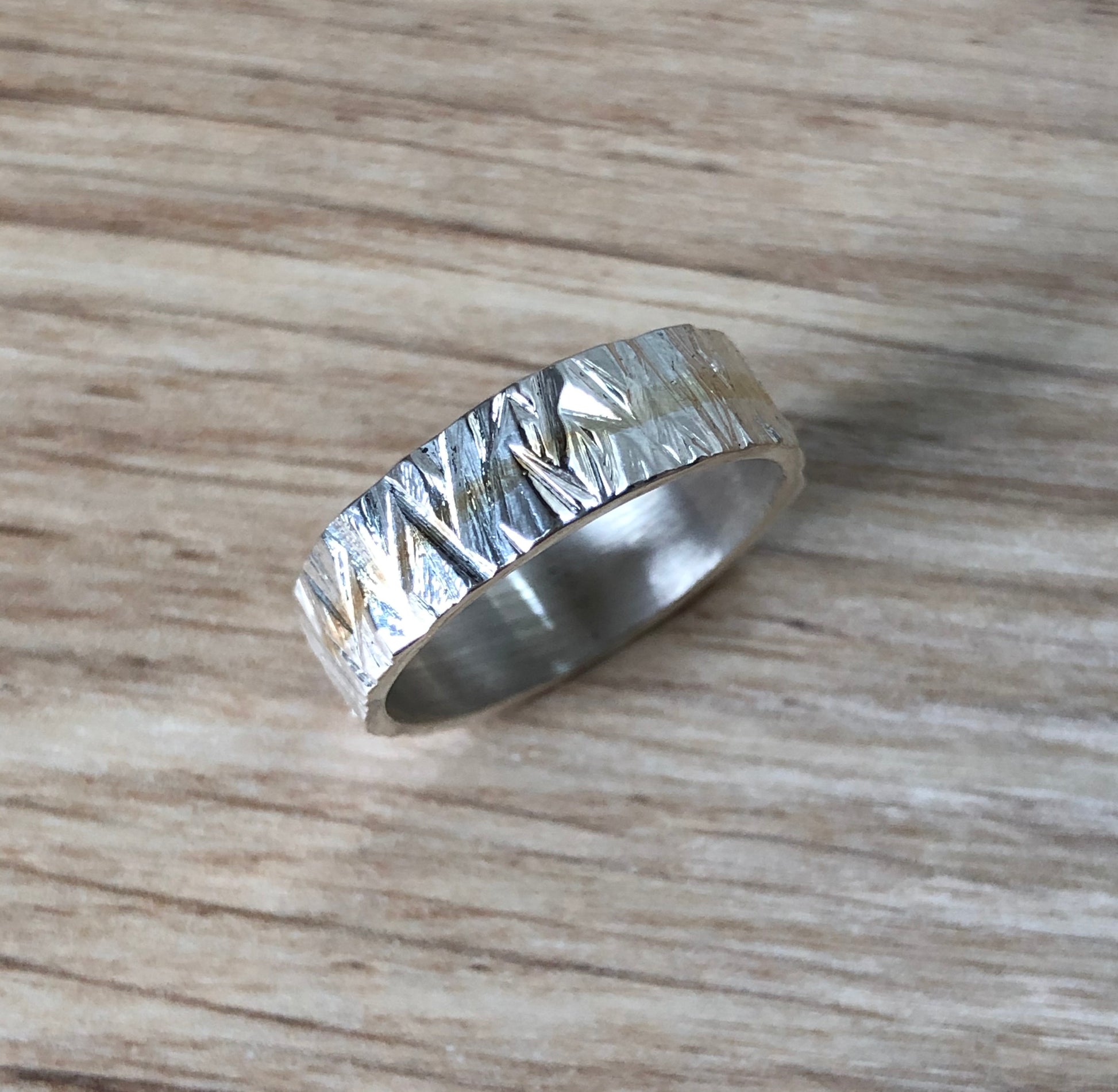 Une fine ligne centrale, délicatement tracée sur une moitié de l’anneau, souligne son caractère à la fois brut et raffiné.