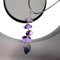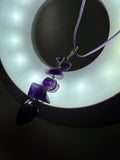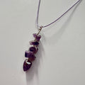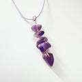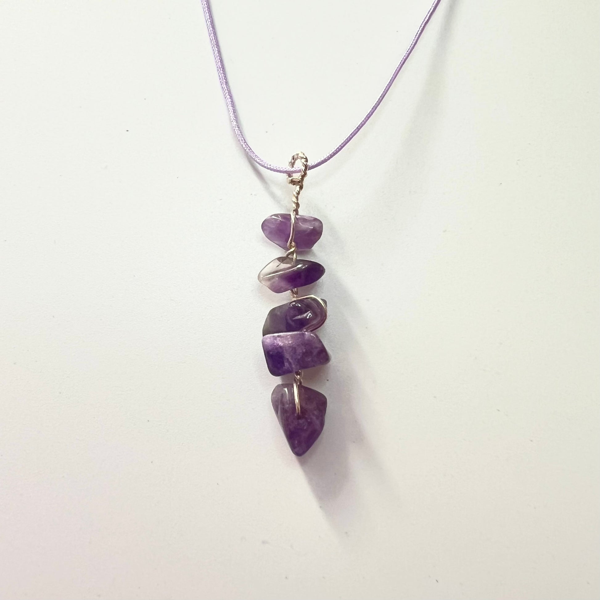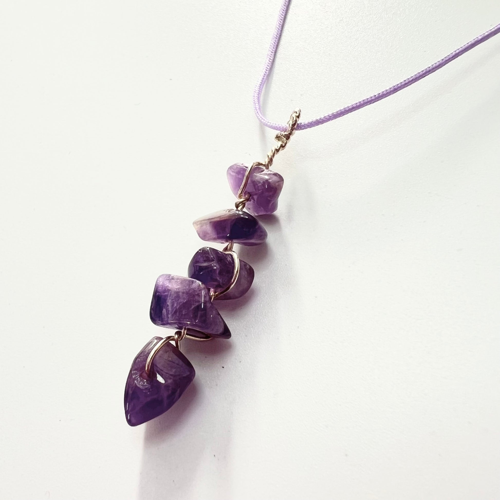 Réalisé avec un cordon nylon couleur parme a noeuds coulissants, il est orné d’un pendentif délicat composé de plusieurs améthystes roulées, montées sur un fil torsadé en argent 925.
