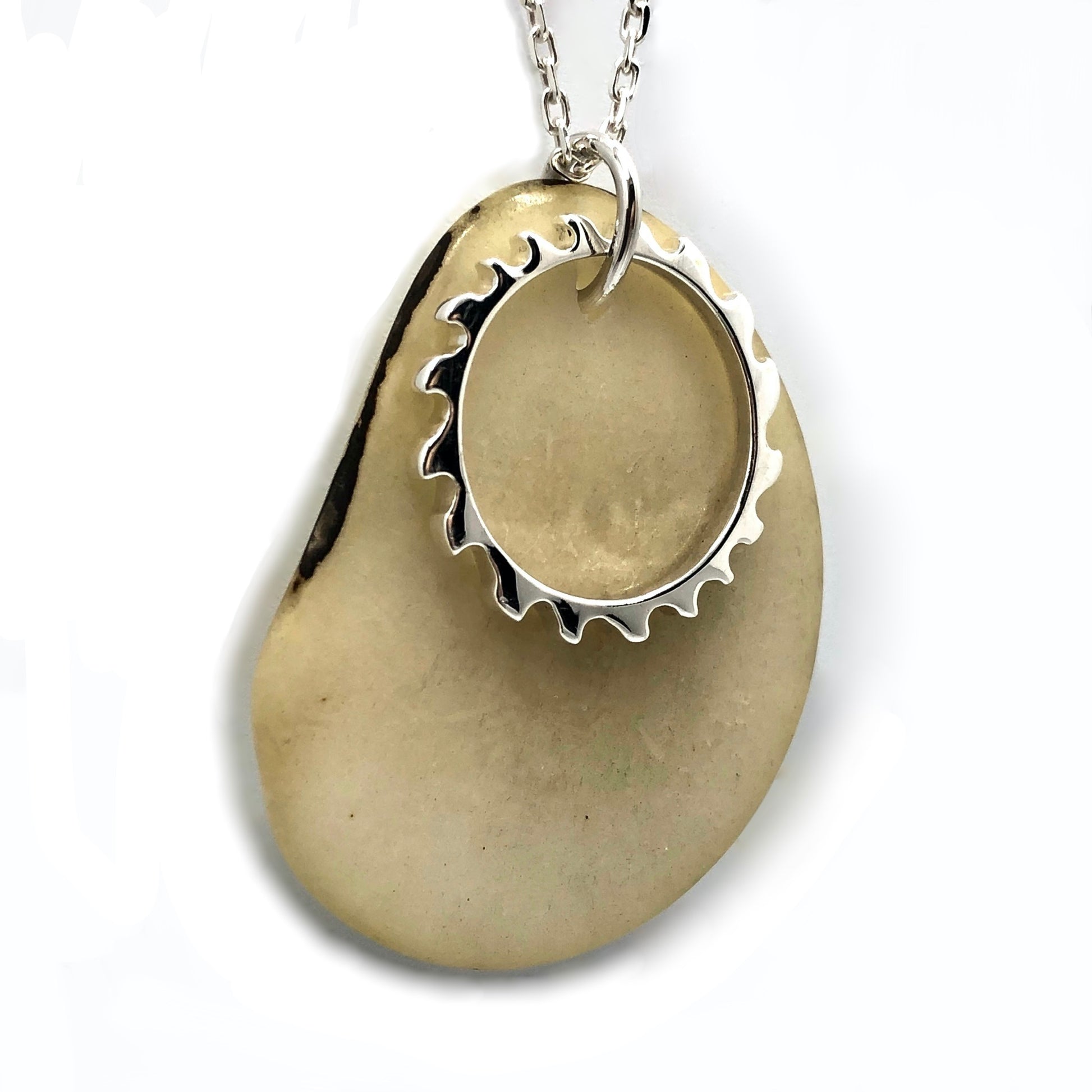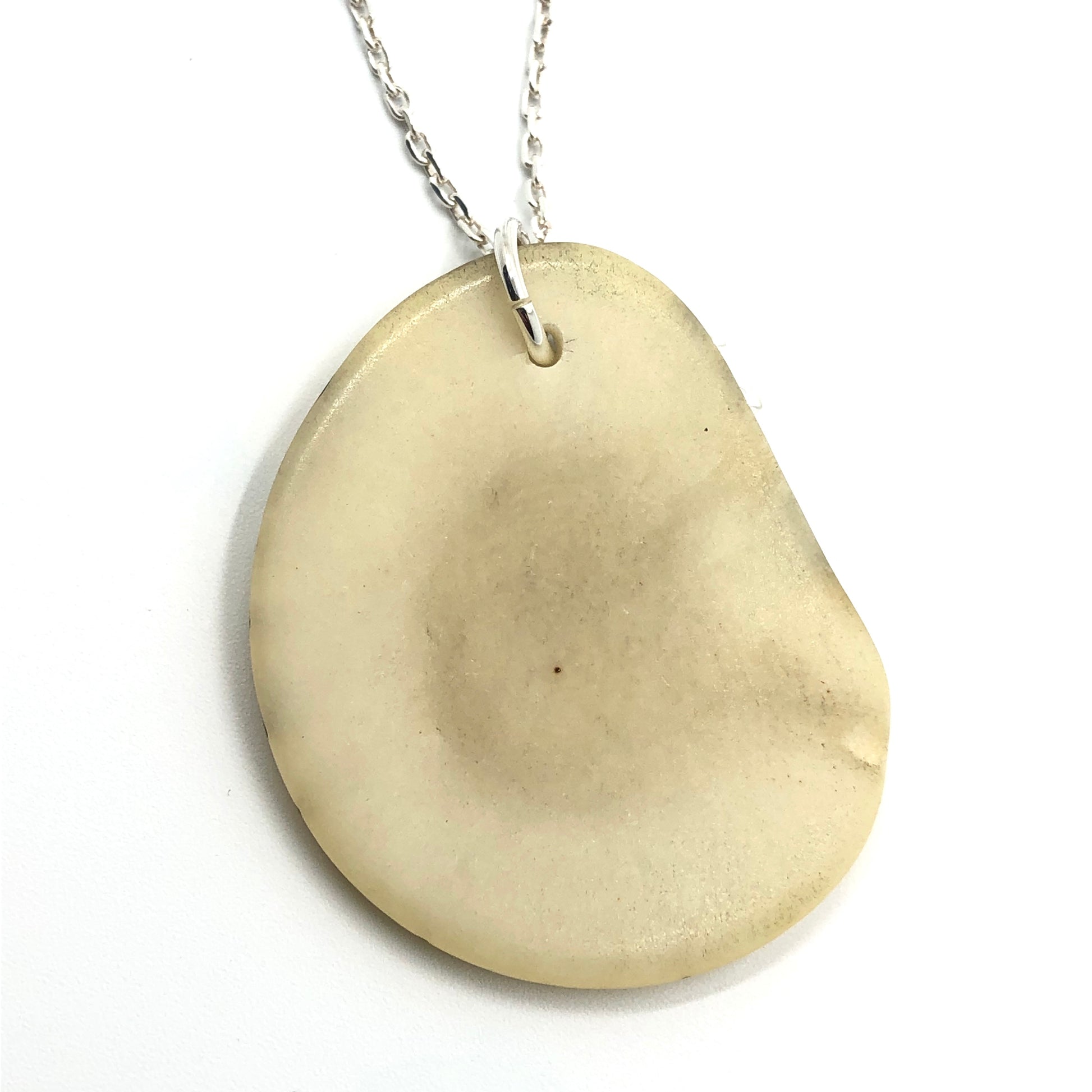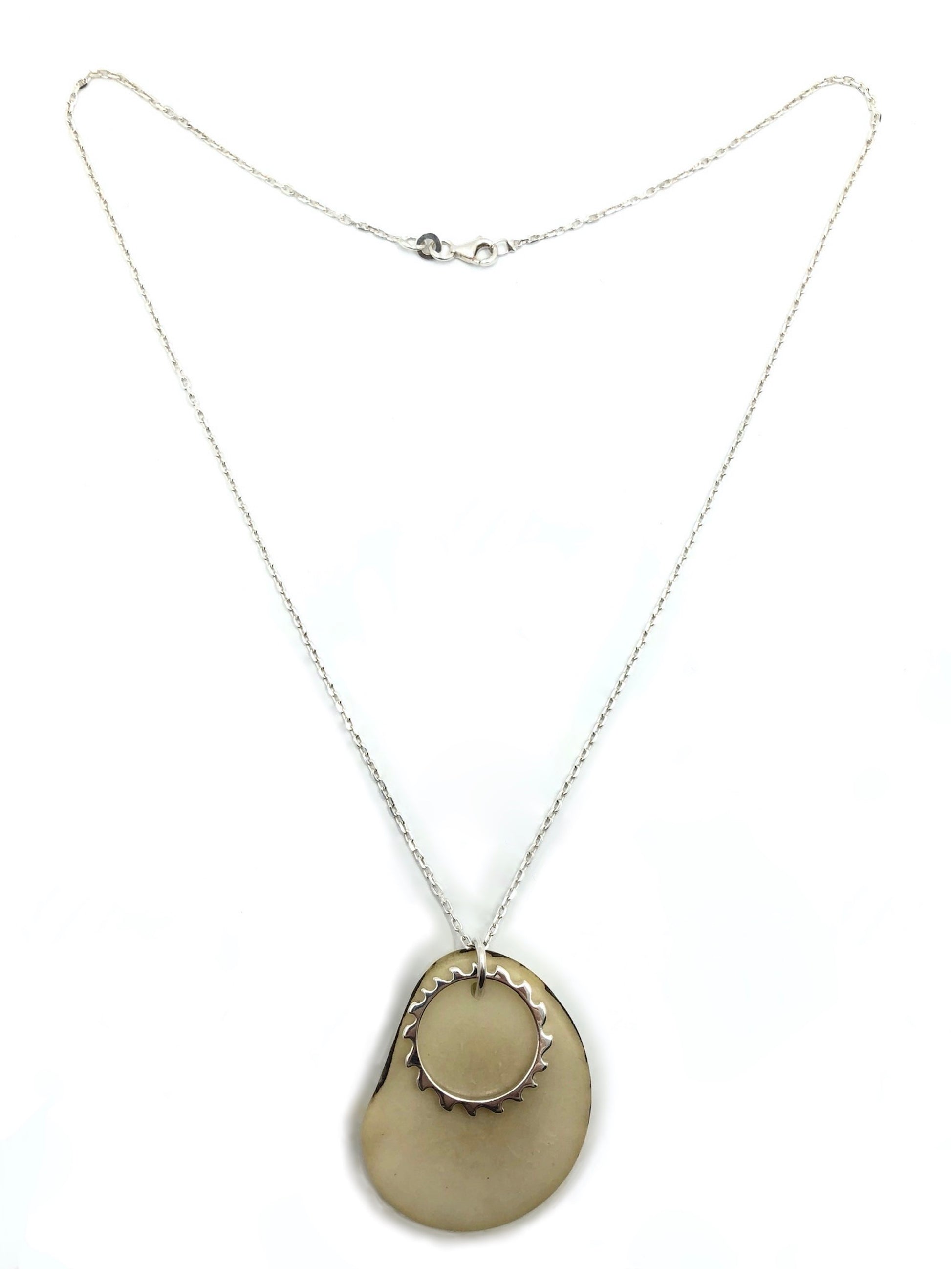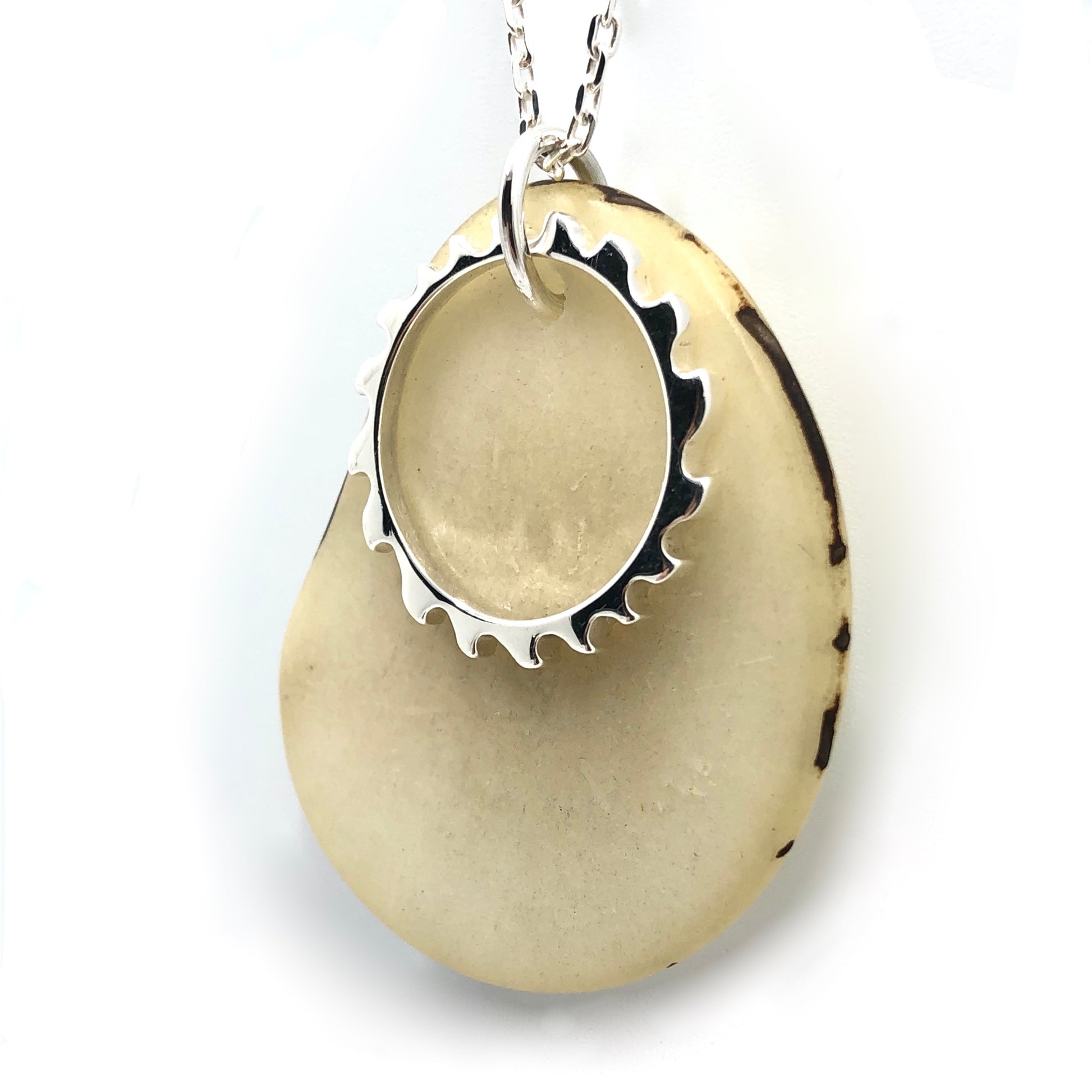 Collier pendentif en argent massif 925/1000, orné d’un élément en tagua — aussi appelée ivoire végétal — de couleur blanche naturelle.