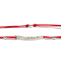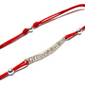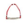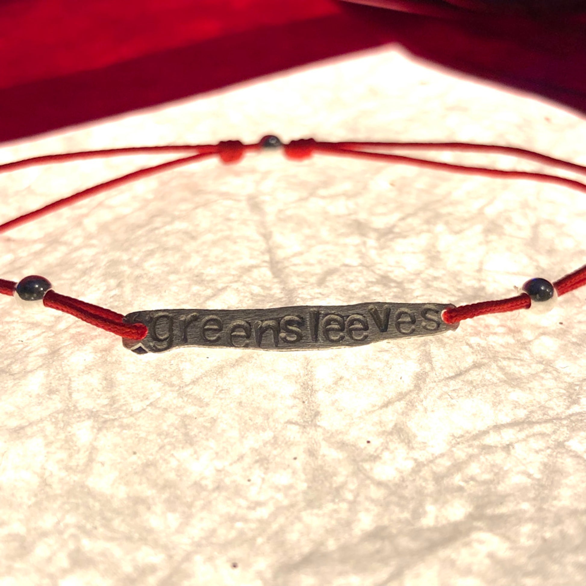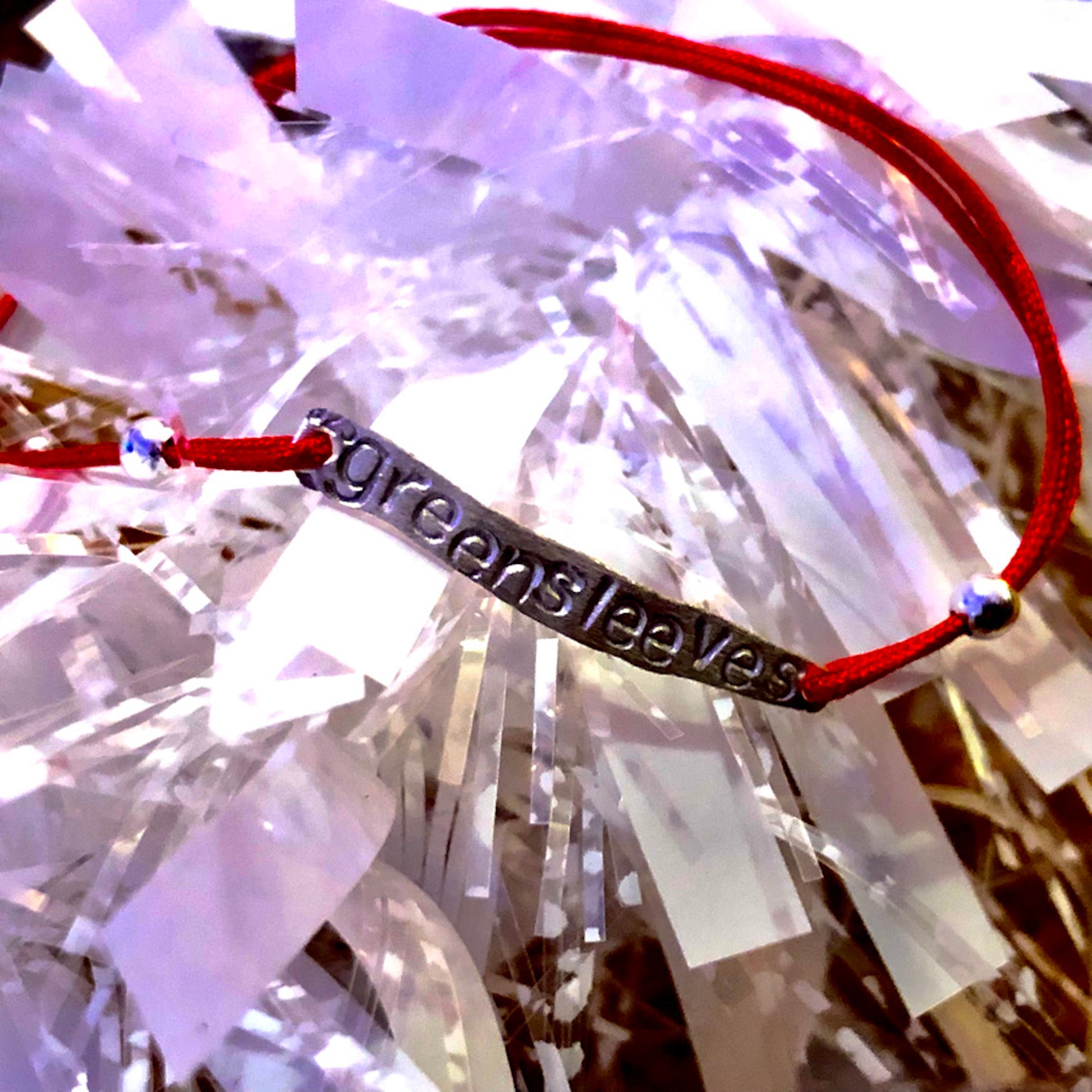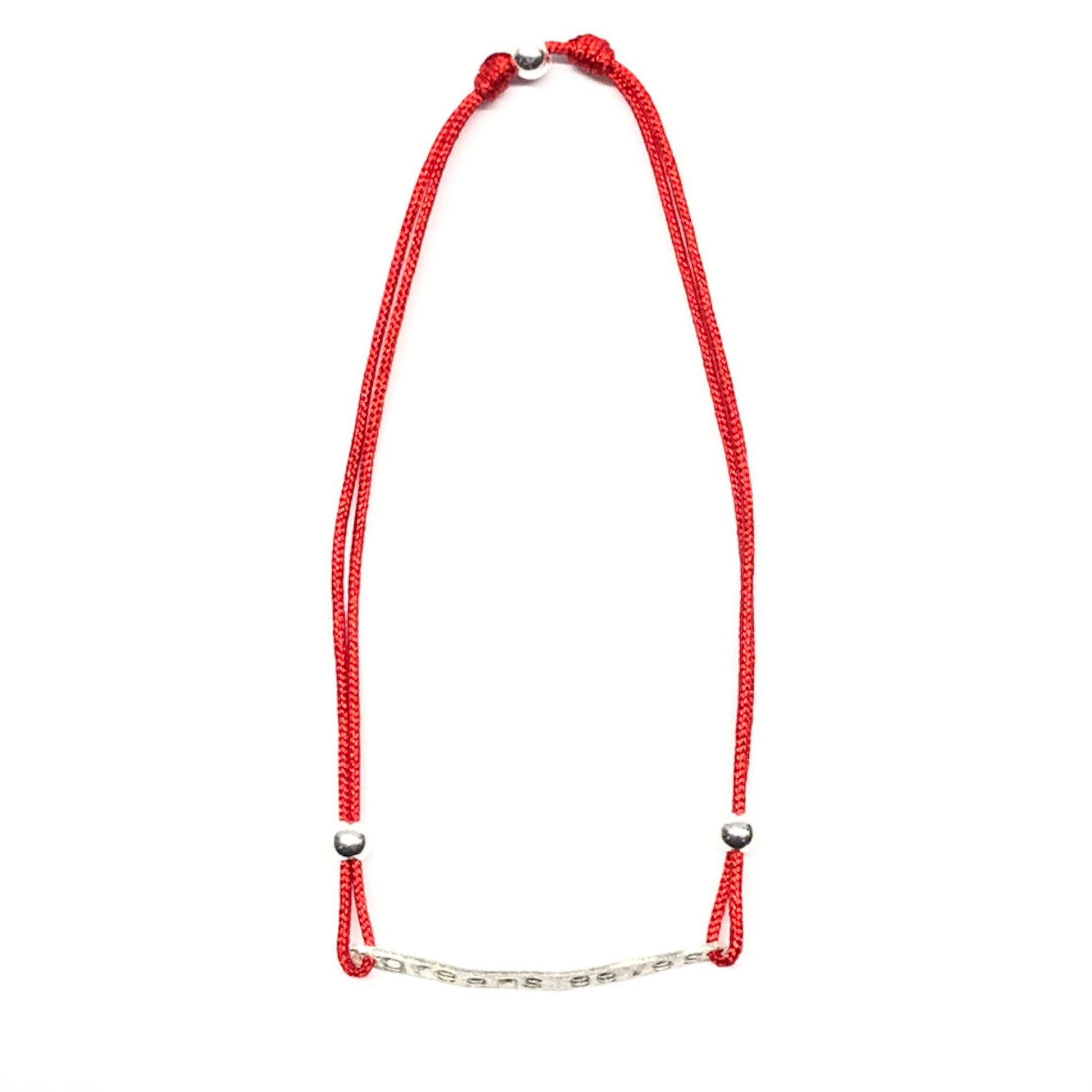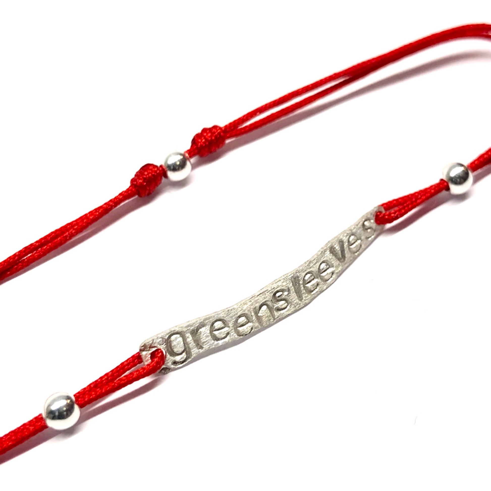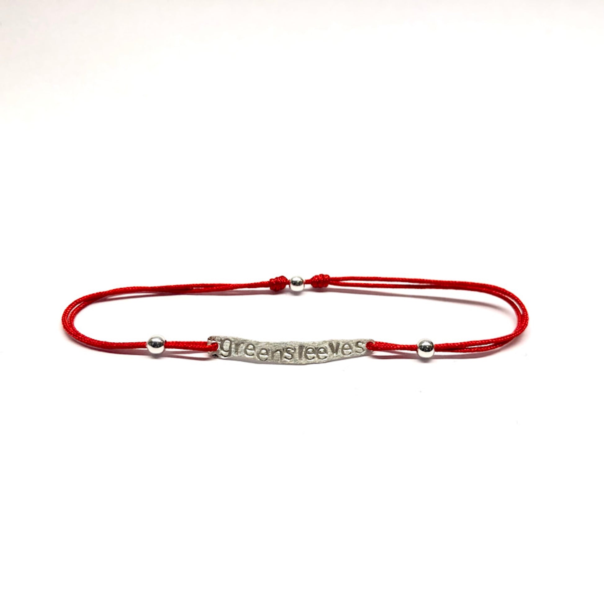 Bracelet en argent massif 925, composé d’une plaque frapée du titre de la chanson, monté sur un cordon nylon rouge avec trois boules de 3mm. en argent 925.