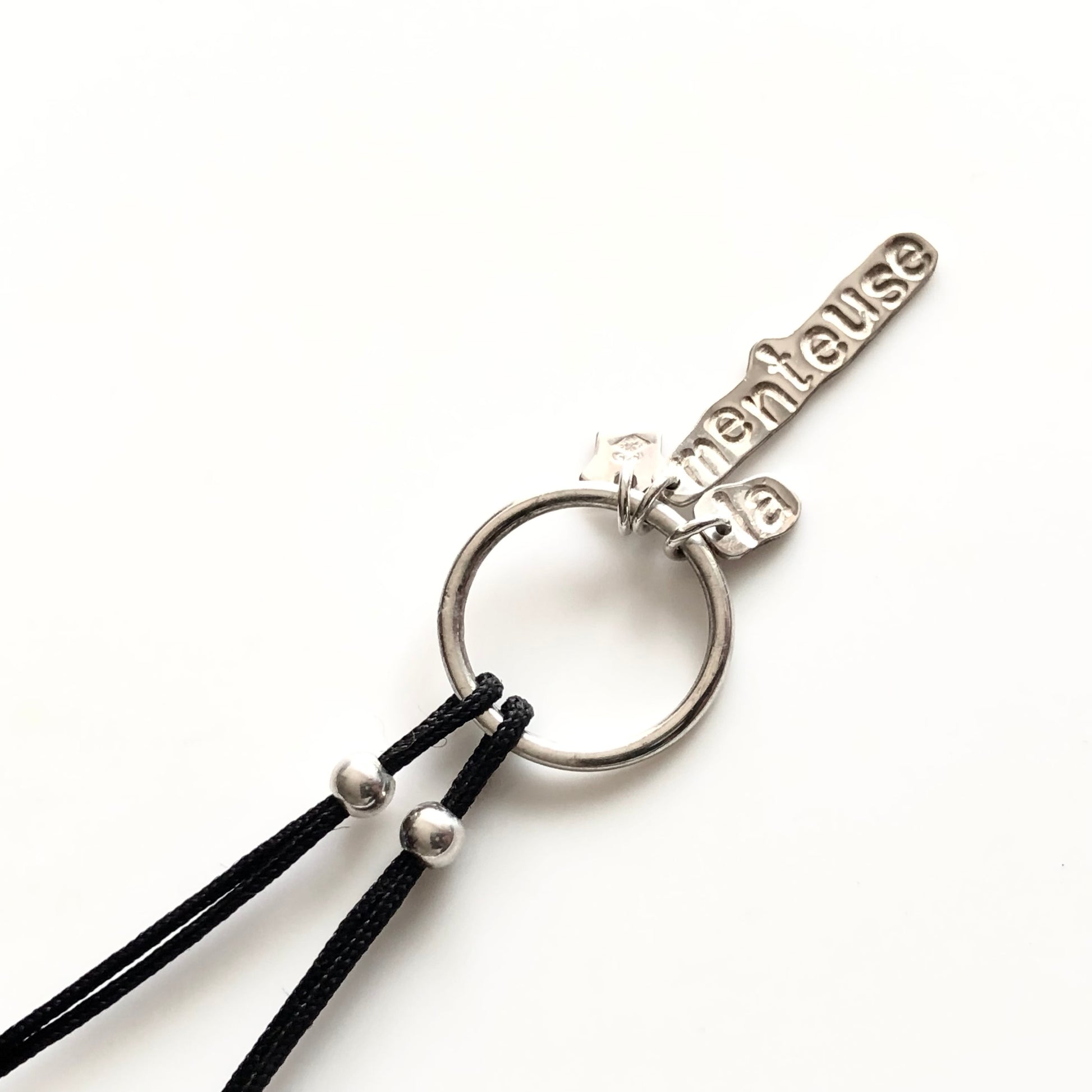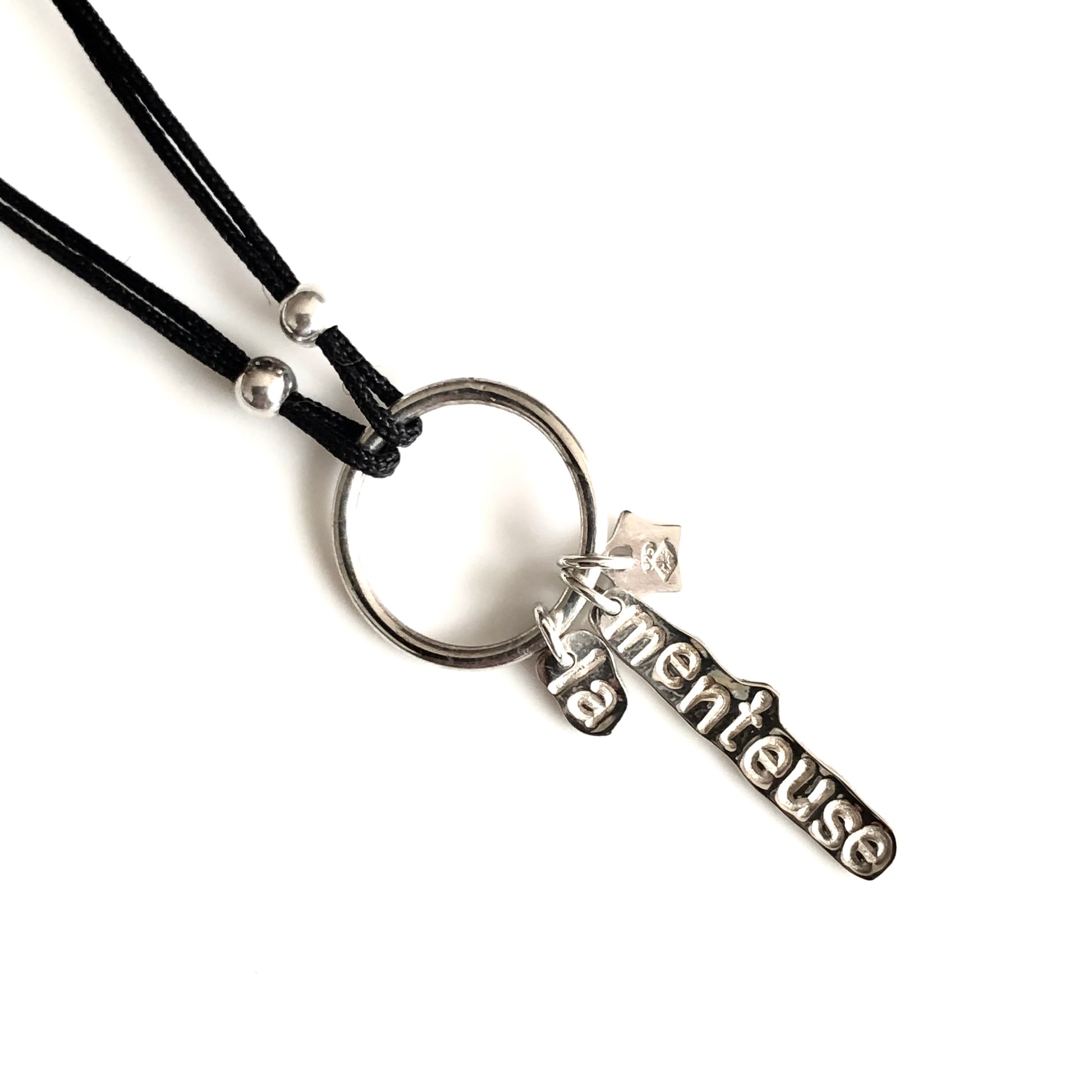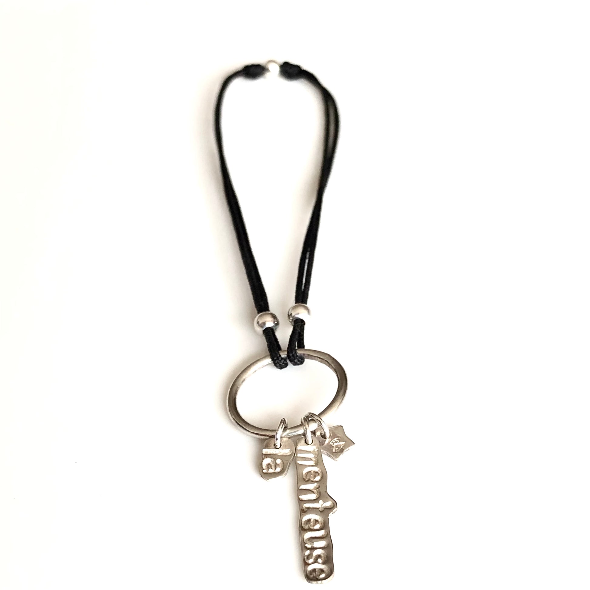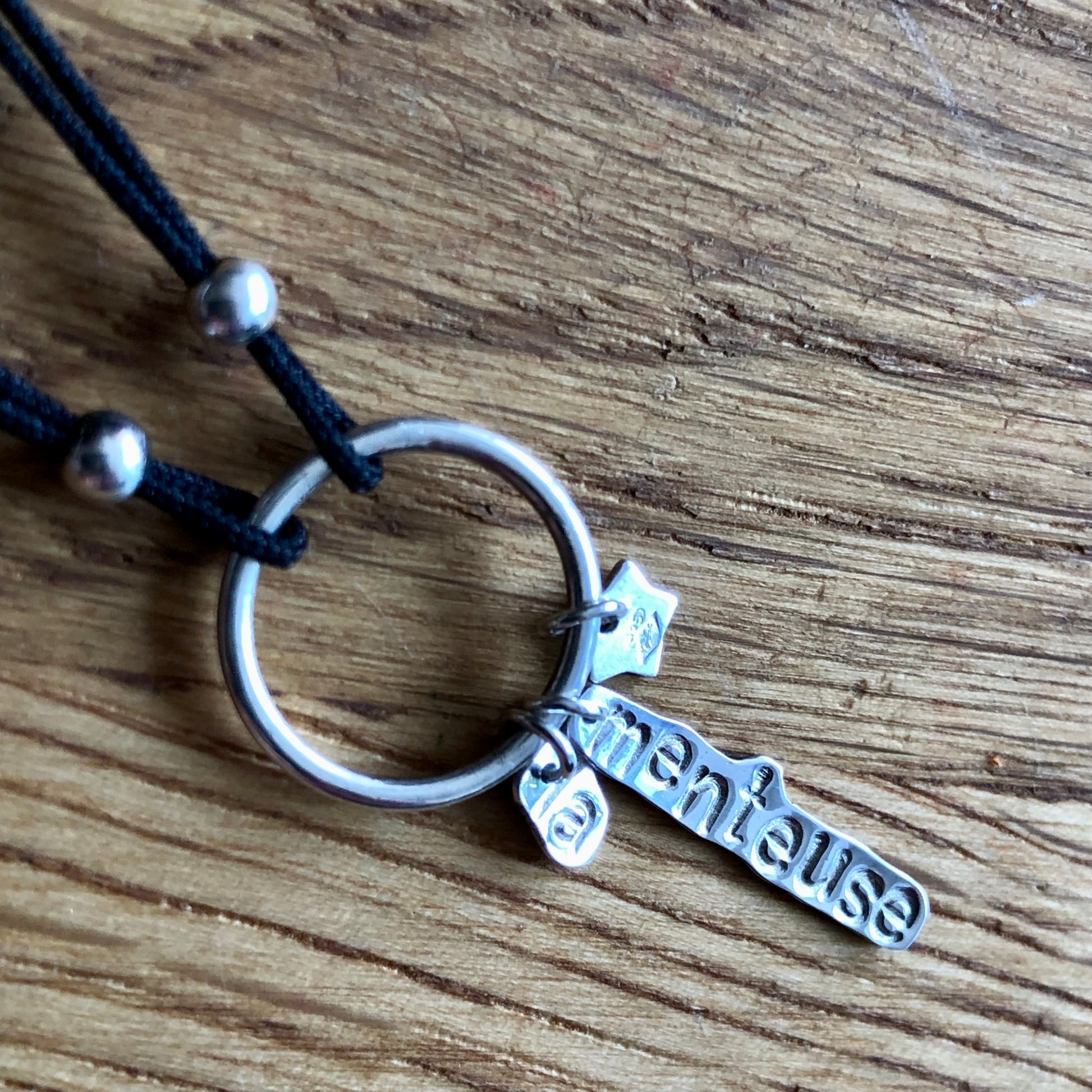Inspiré de la chanson La menteuse de Carmen Maria Vega, ce bracelet unique associe simplicité et émotion. Chaque pampille en argent massif 925 est frappée à la main des mots qui composent le titre, rendant chaque pièce singulière et profondément personnelle.