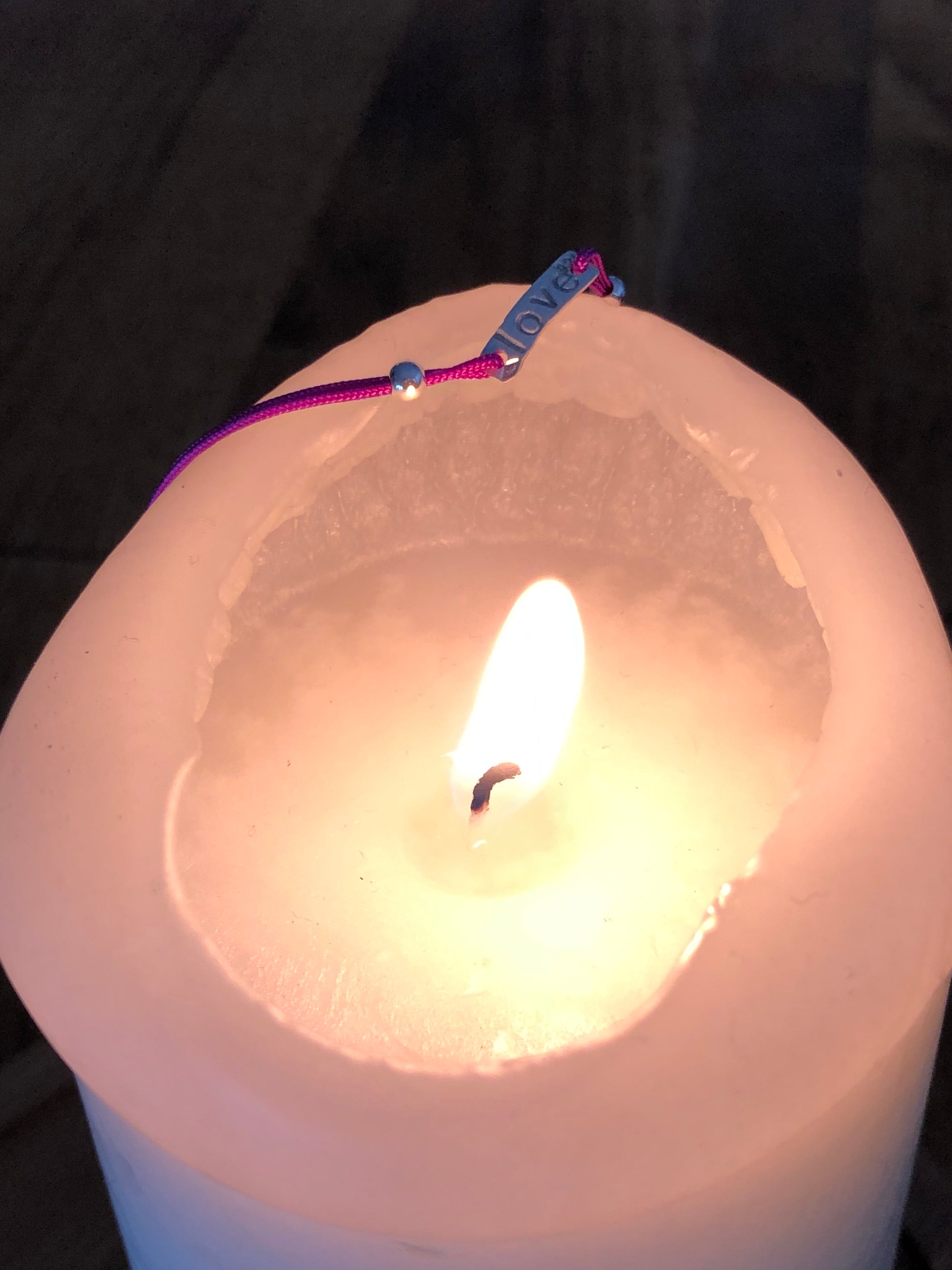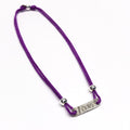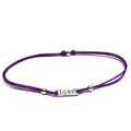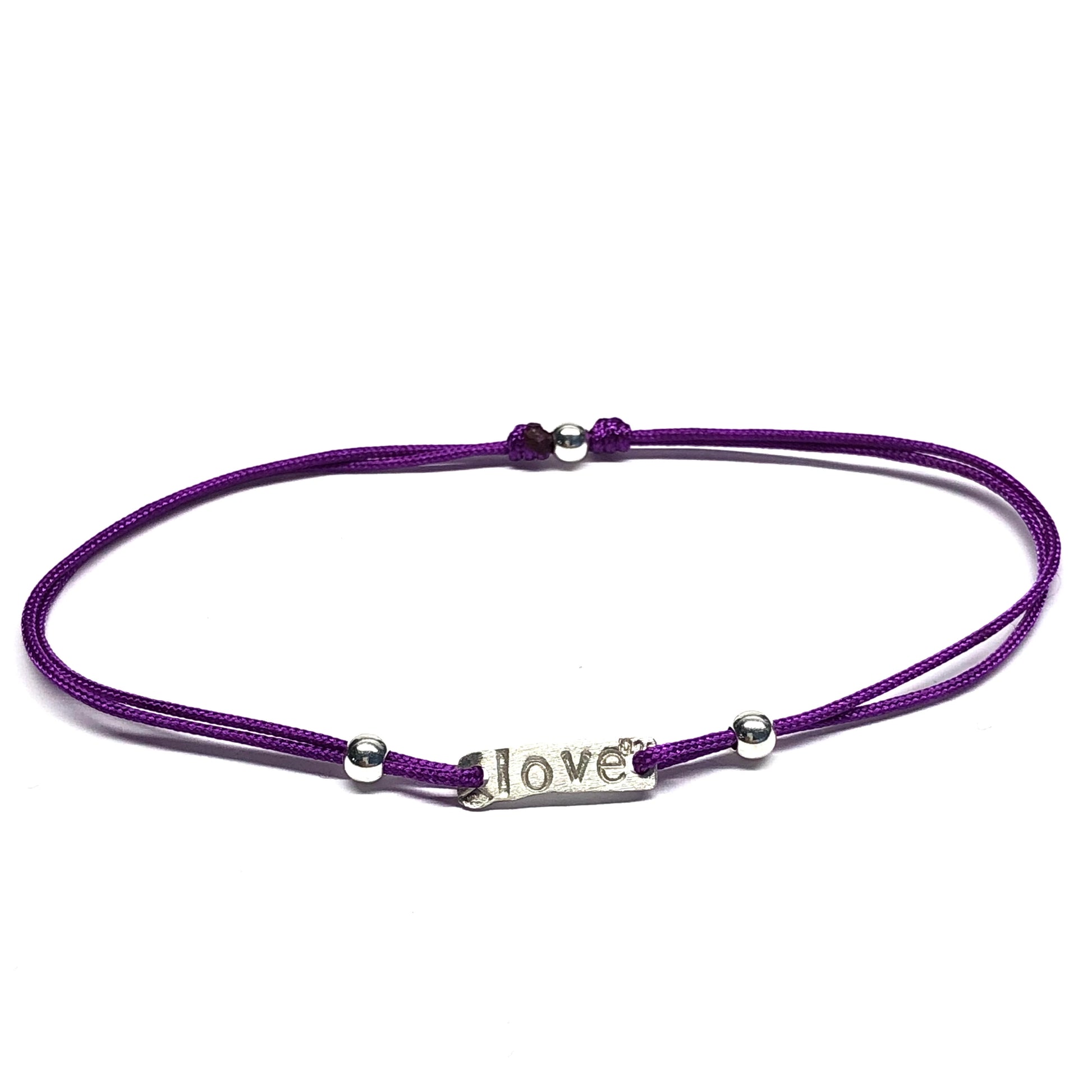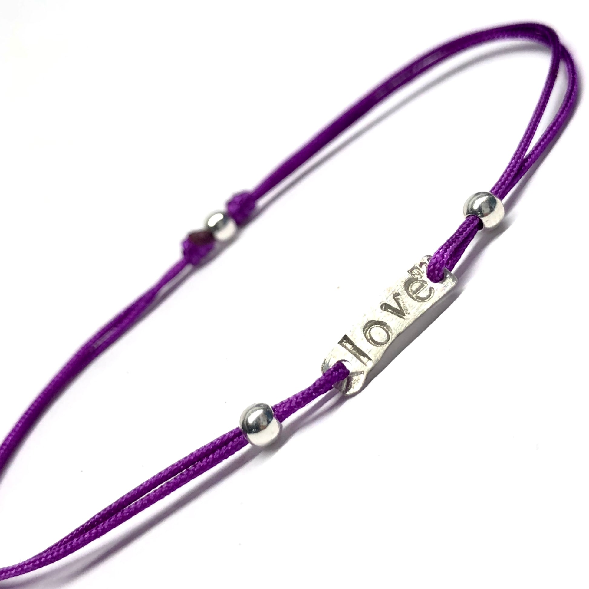 Bracelet en argent massif 925, composé d’une plaque frapée du titre de la chanson, monté sur un cordon nylon violet avec trois boules de 3mm. en argent 925.