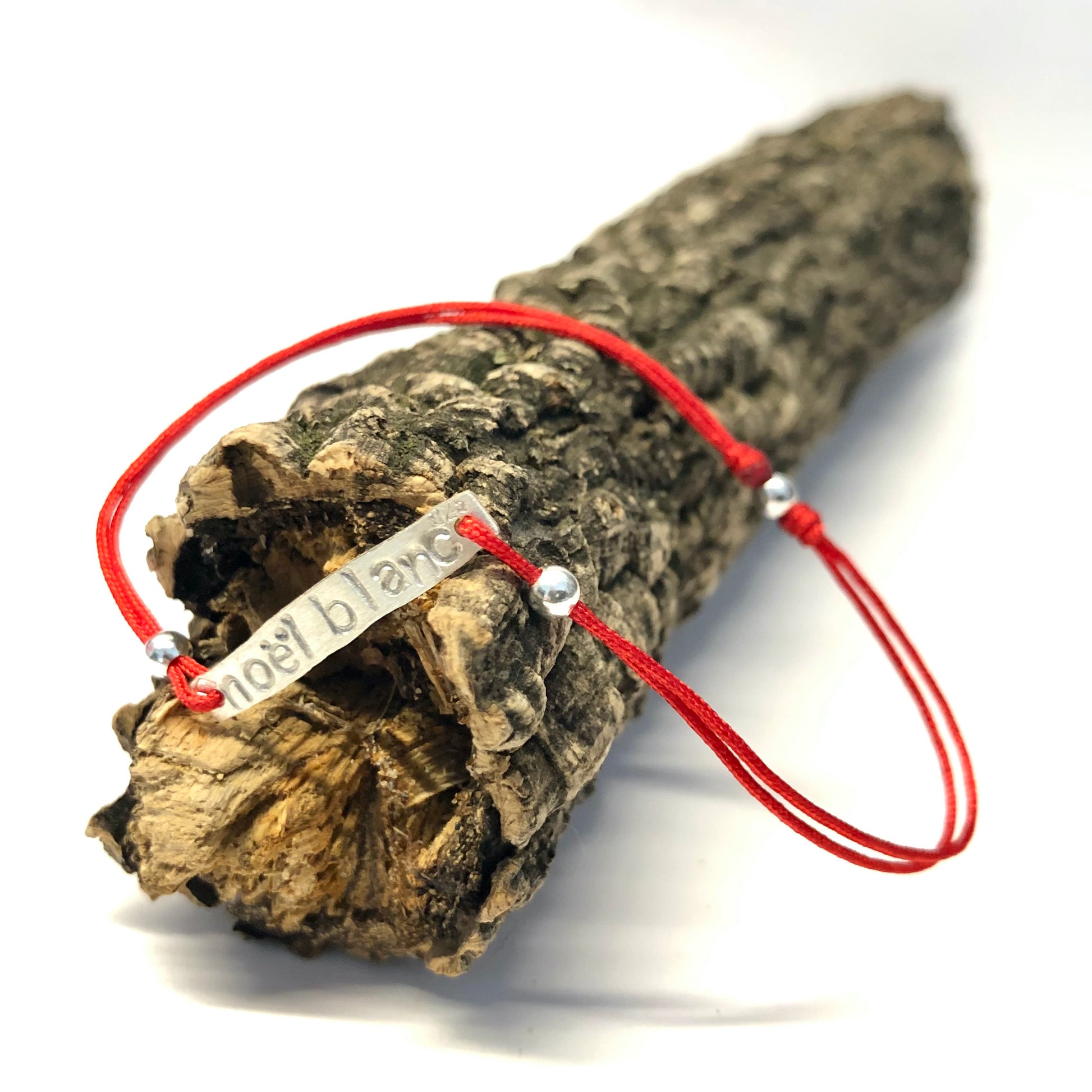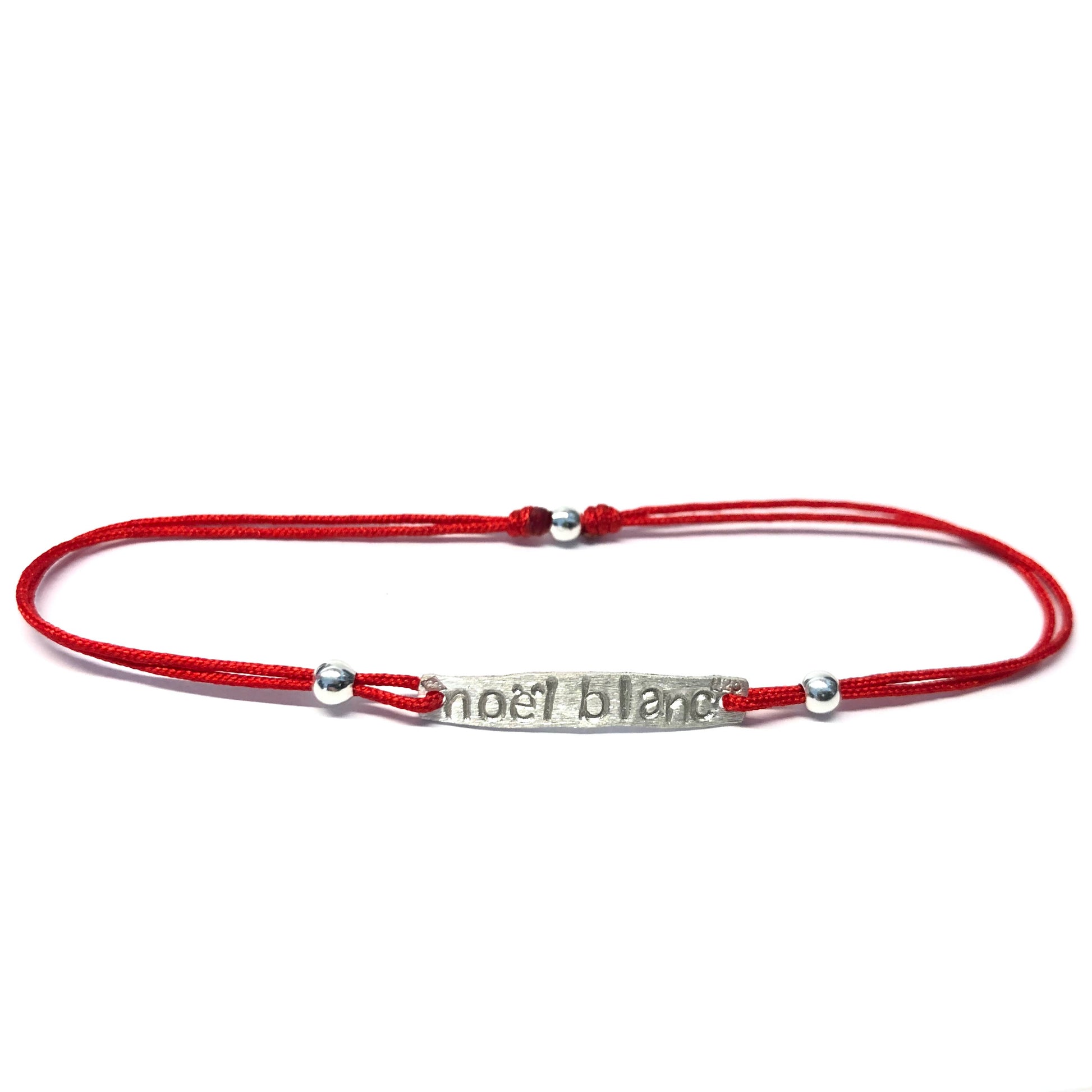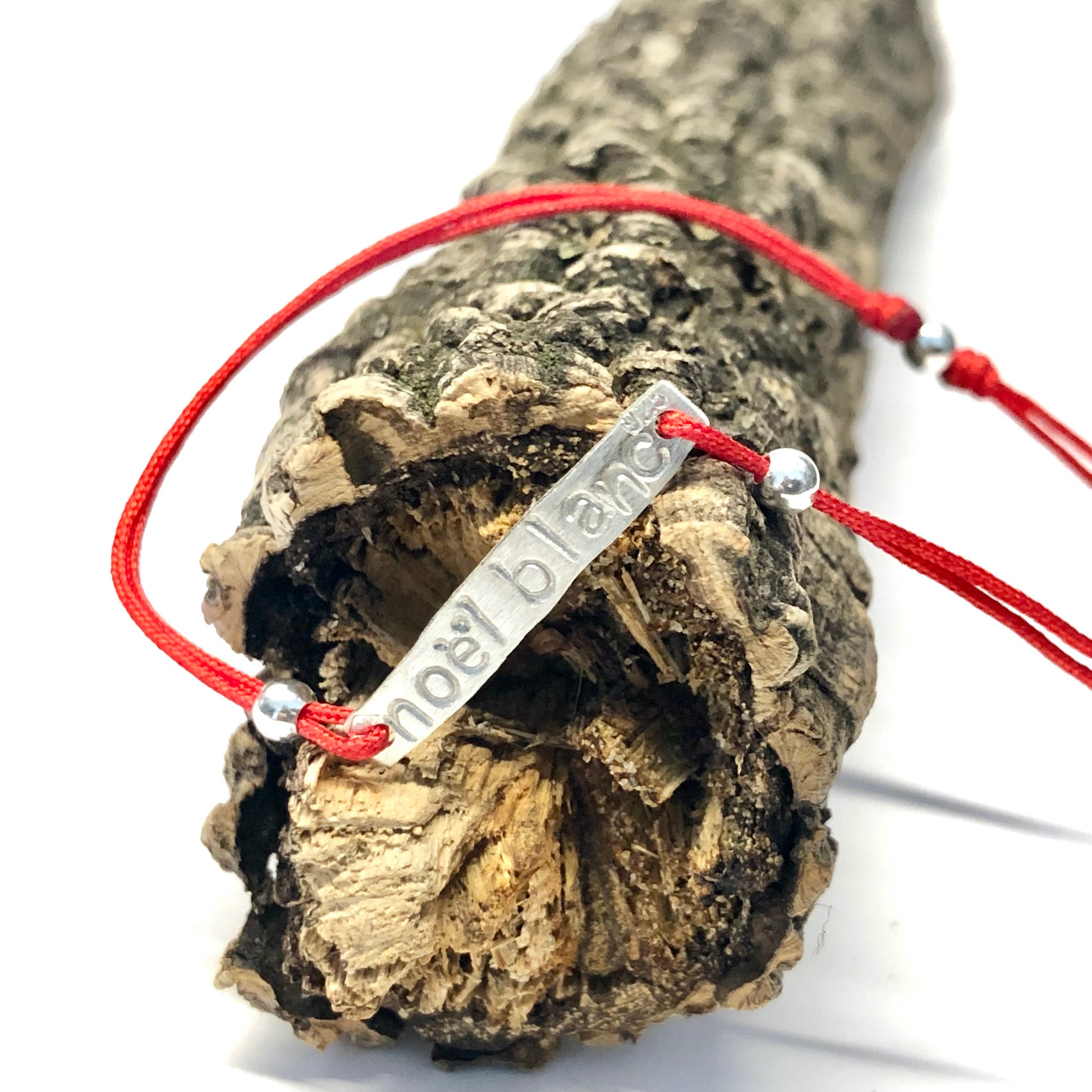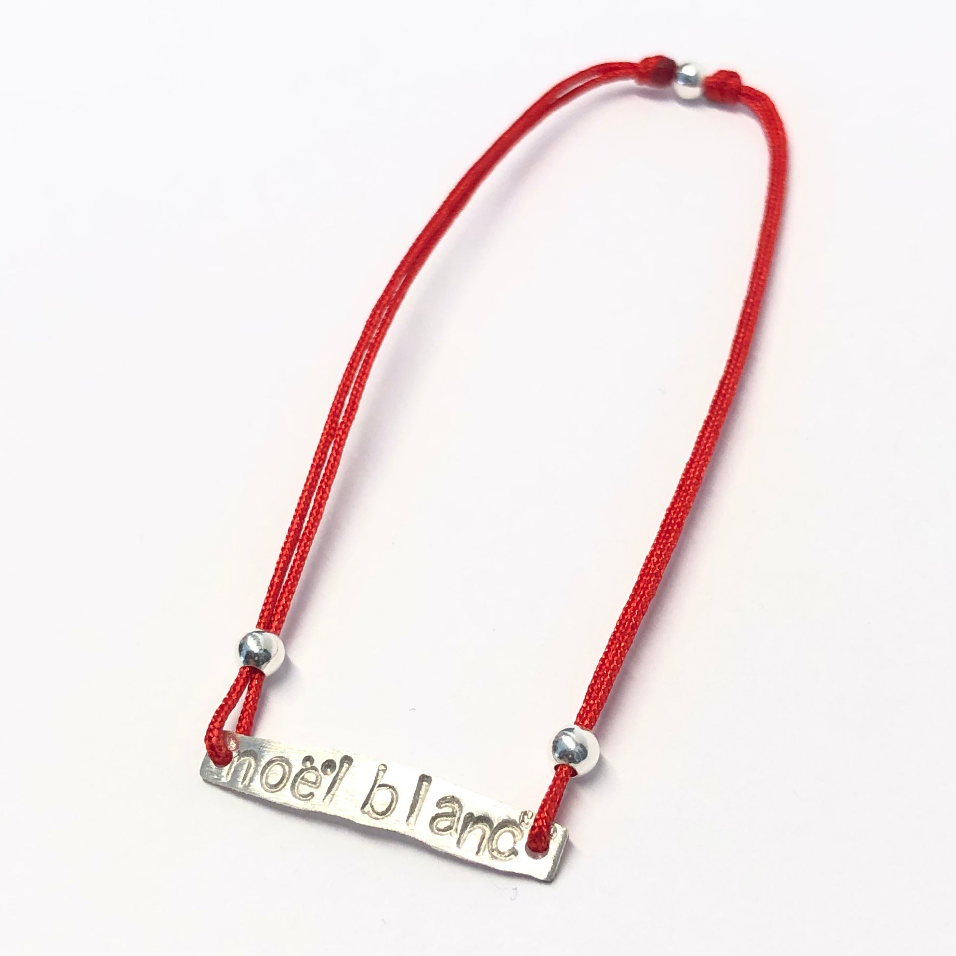 Bracelet en argent massif 925, composé d’une plaque frapée du titre de la chanson, monté sur un cordon nylon rouge avec trois boules de 3mm. en argent 925.