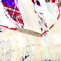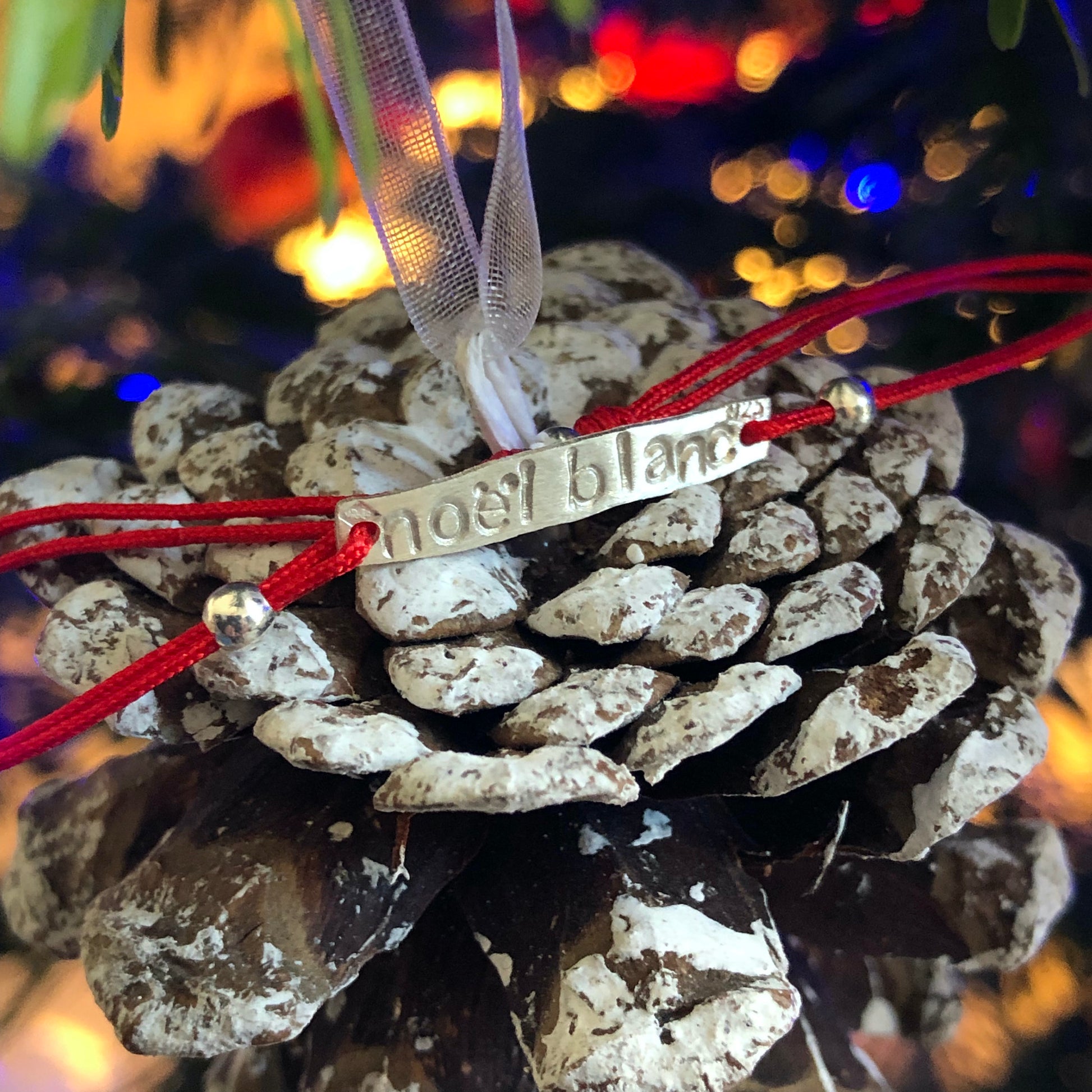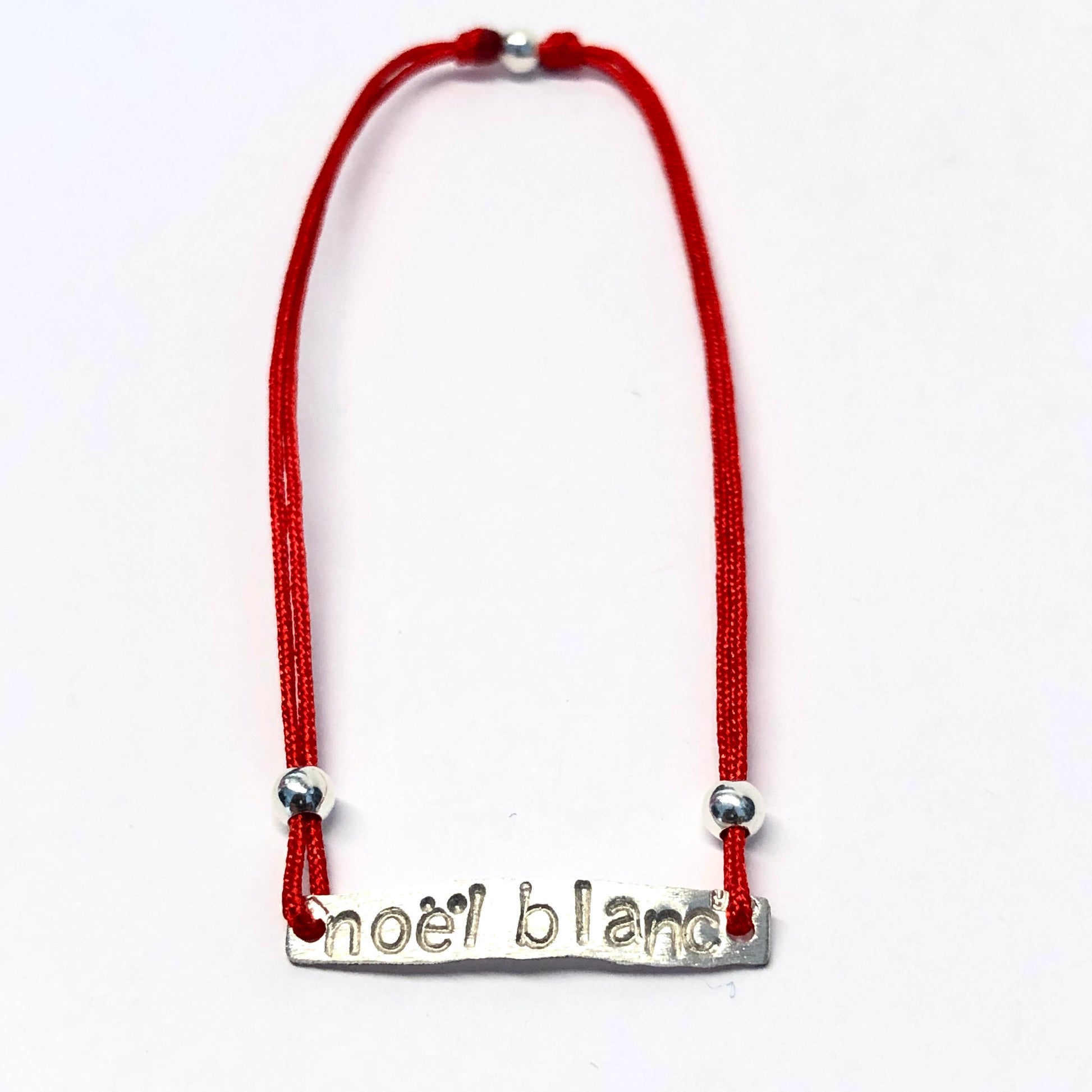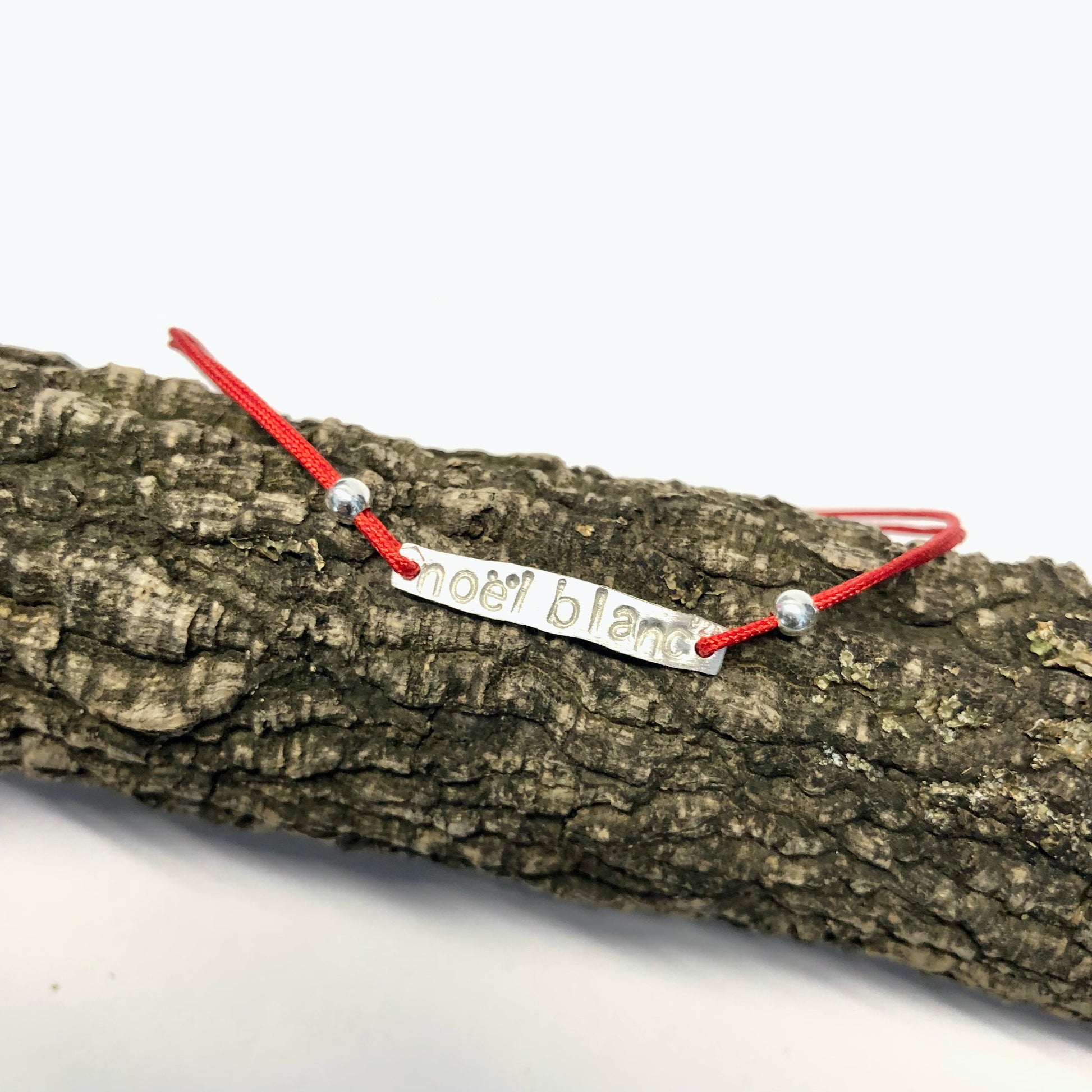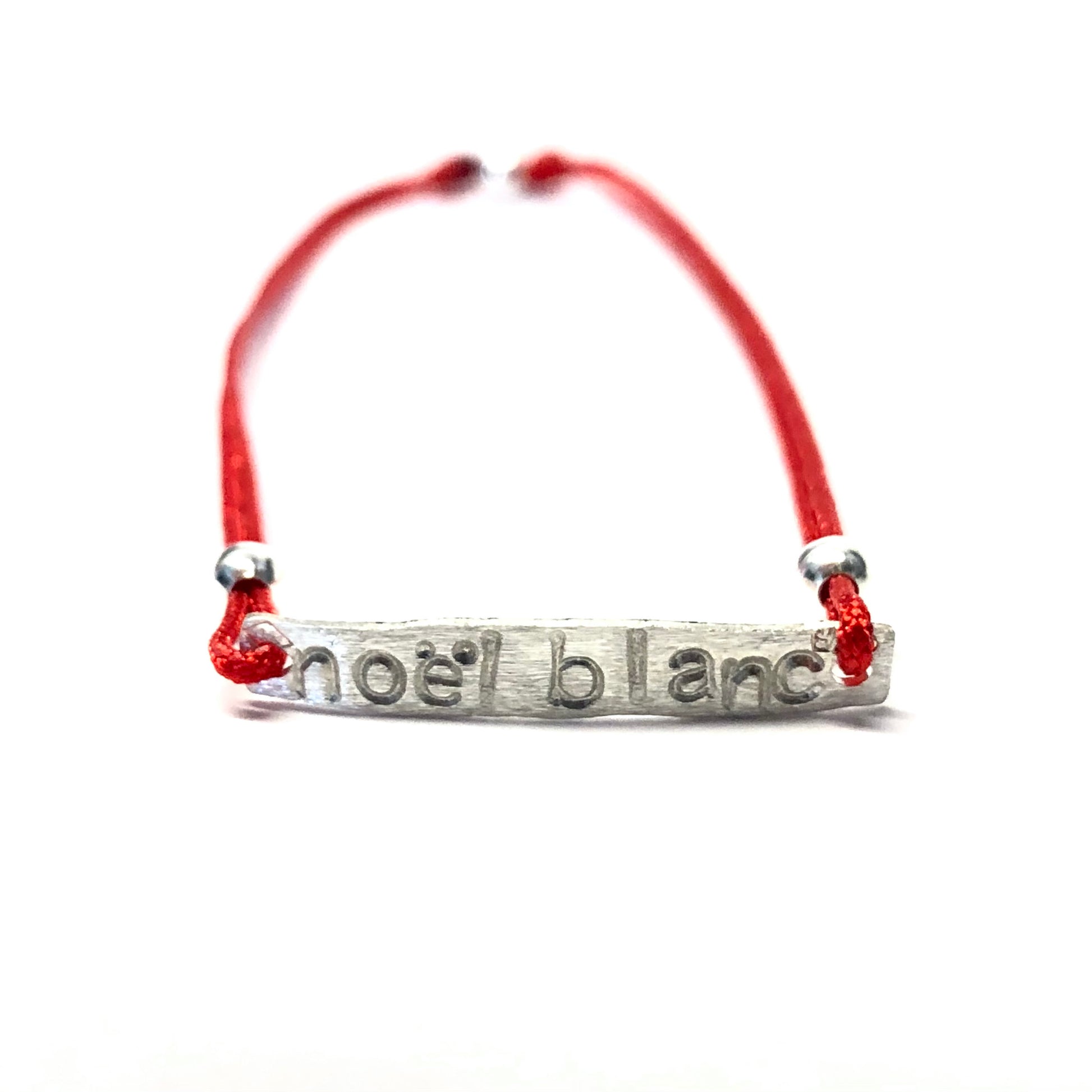 Bracelet en argent massif 925, composé d’une plaque frapée du titre de la chanson, monté sur un cordon nylon rouge avec trois boules de 3mm. en argent 925.