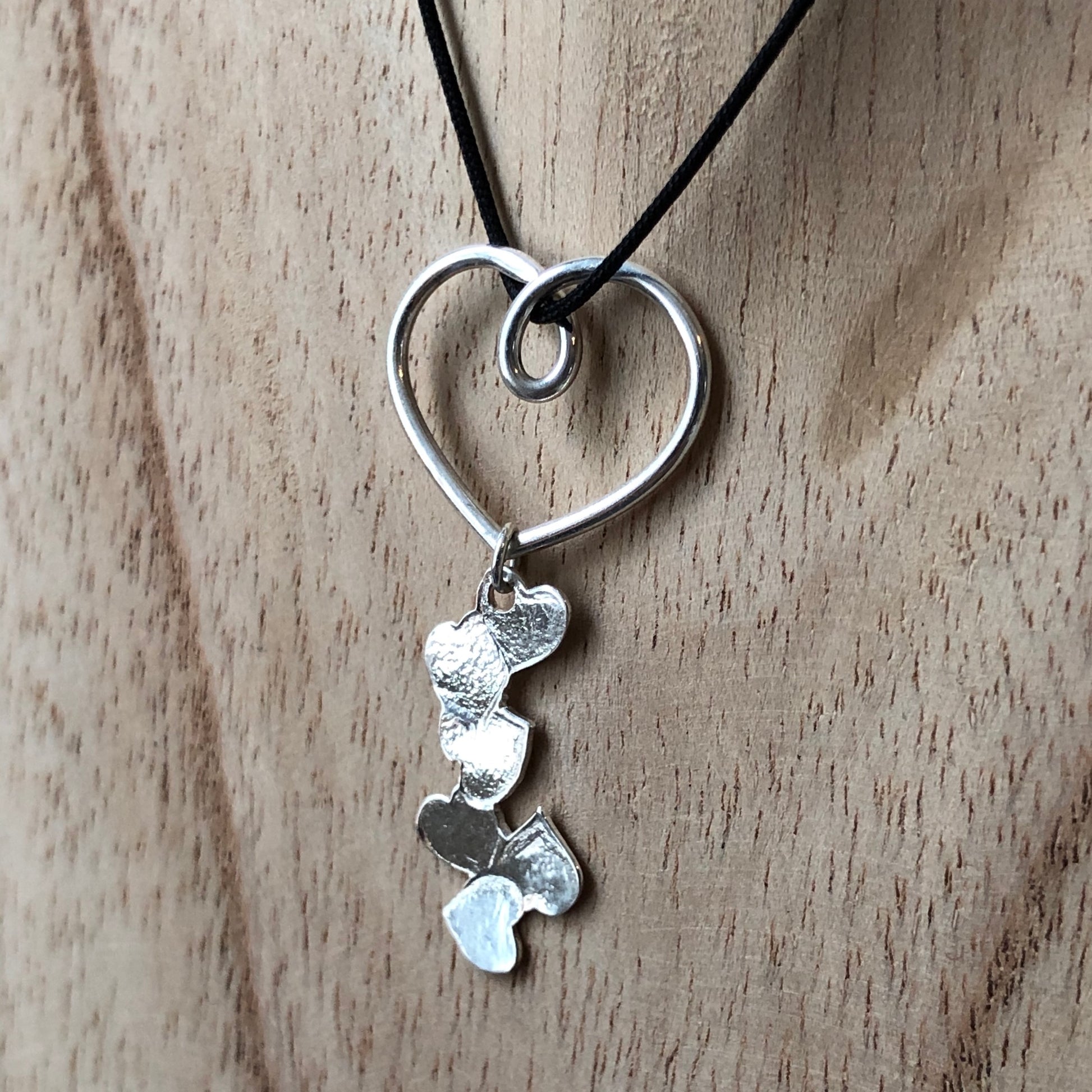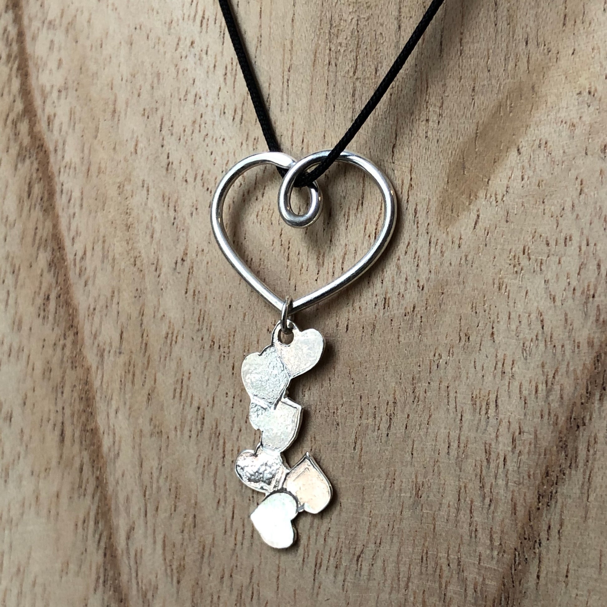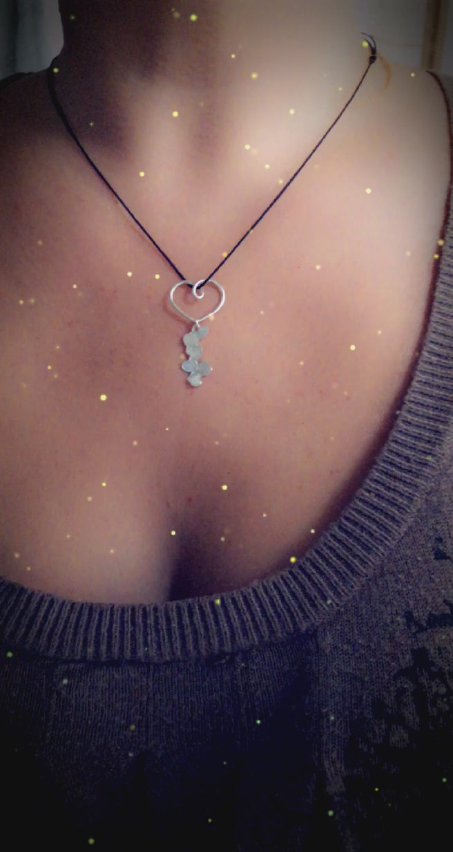 Un cœur en fil d’argent accueille une coulée de petits cœurs que j’ai frappés sur une plaque de métal pour ensuite les découper à la scie.