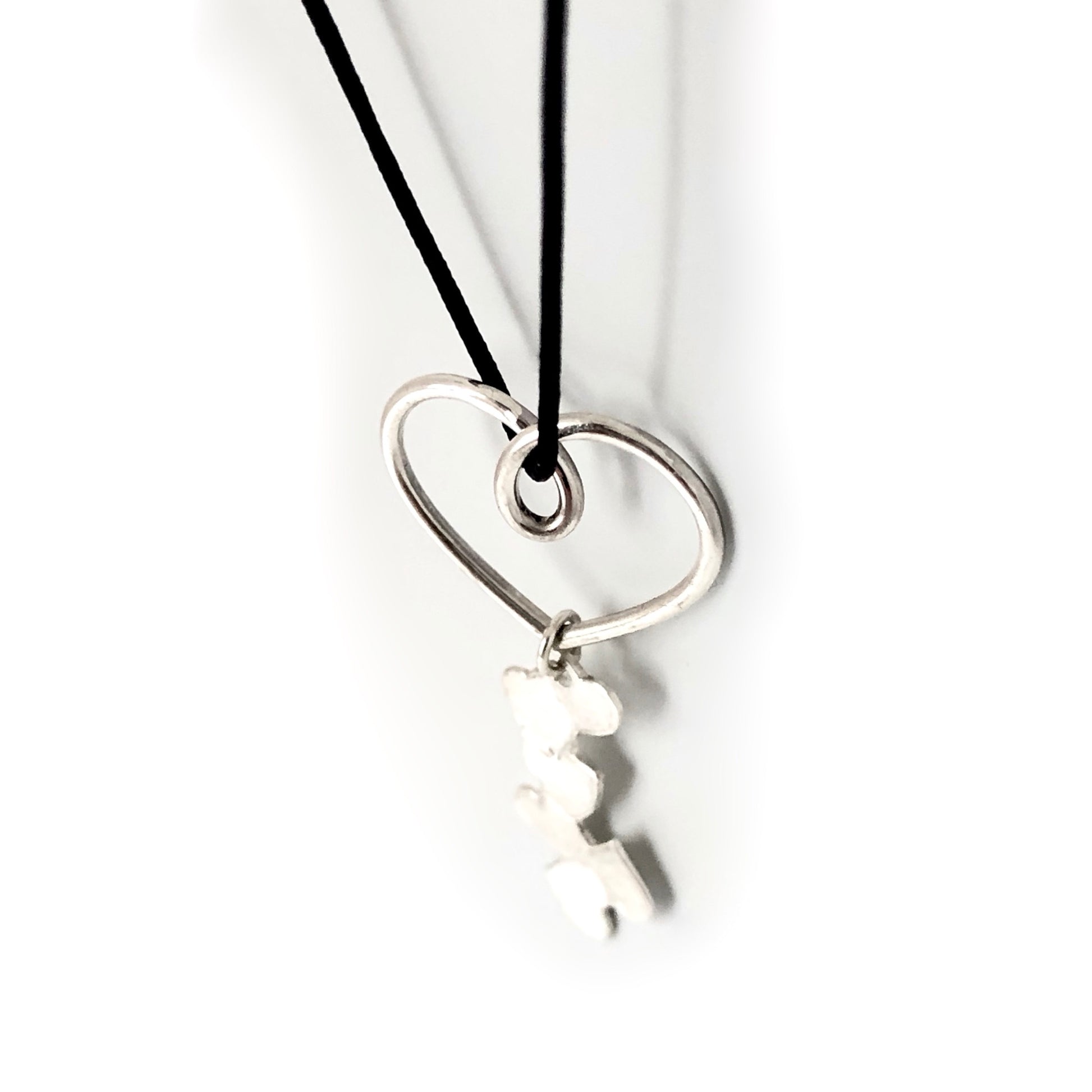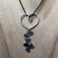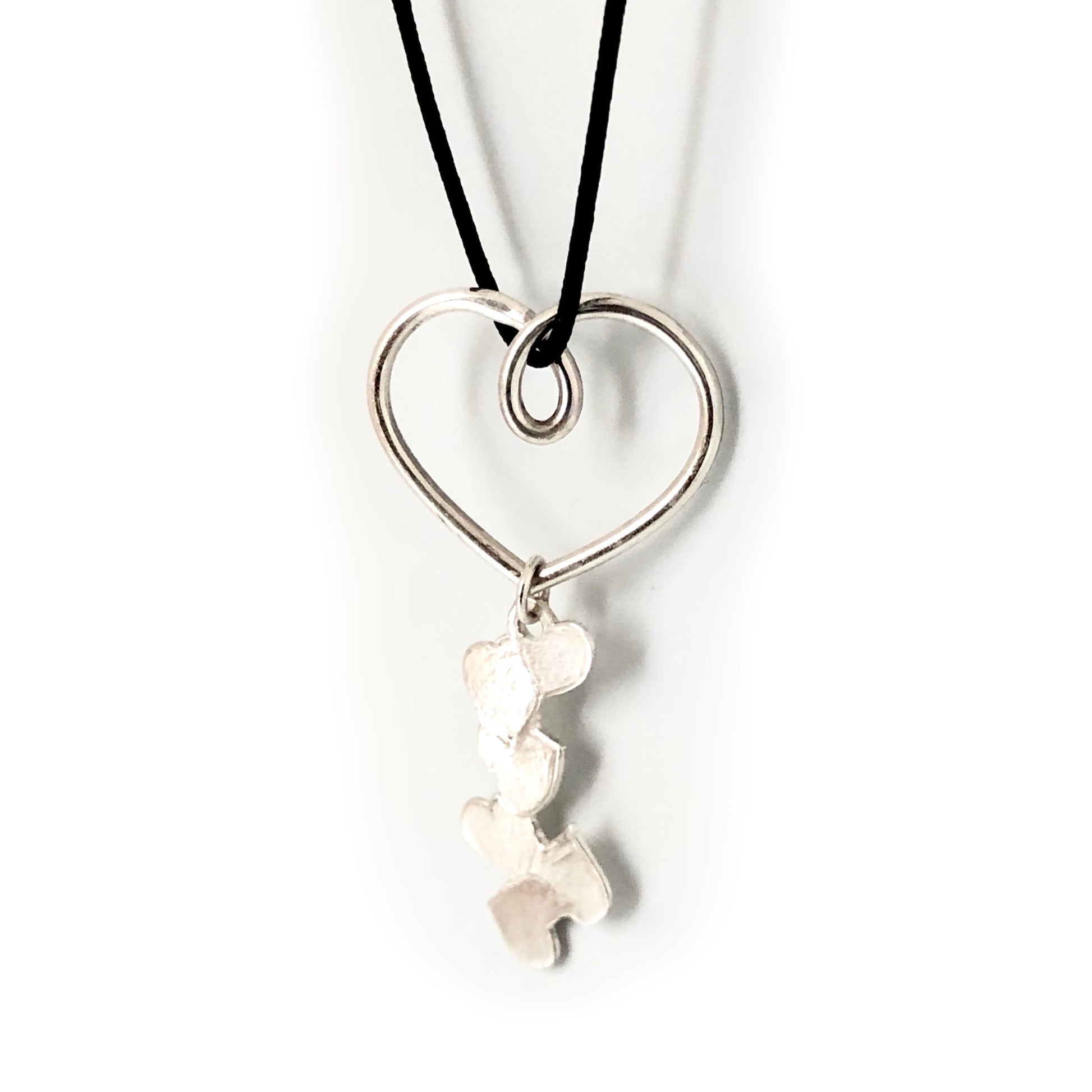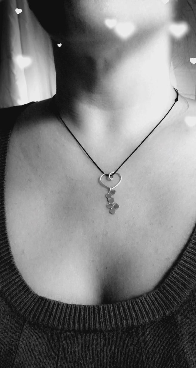 Un cœur en fil d’argent accueille une coulée de petits cœurs que j’ai frappés sur une plaque de métal pour ensuite les découper à la scie.