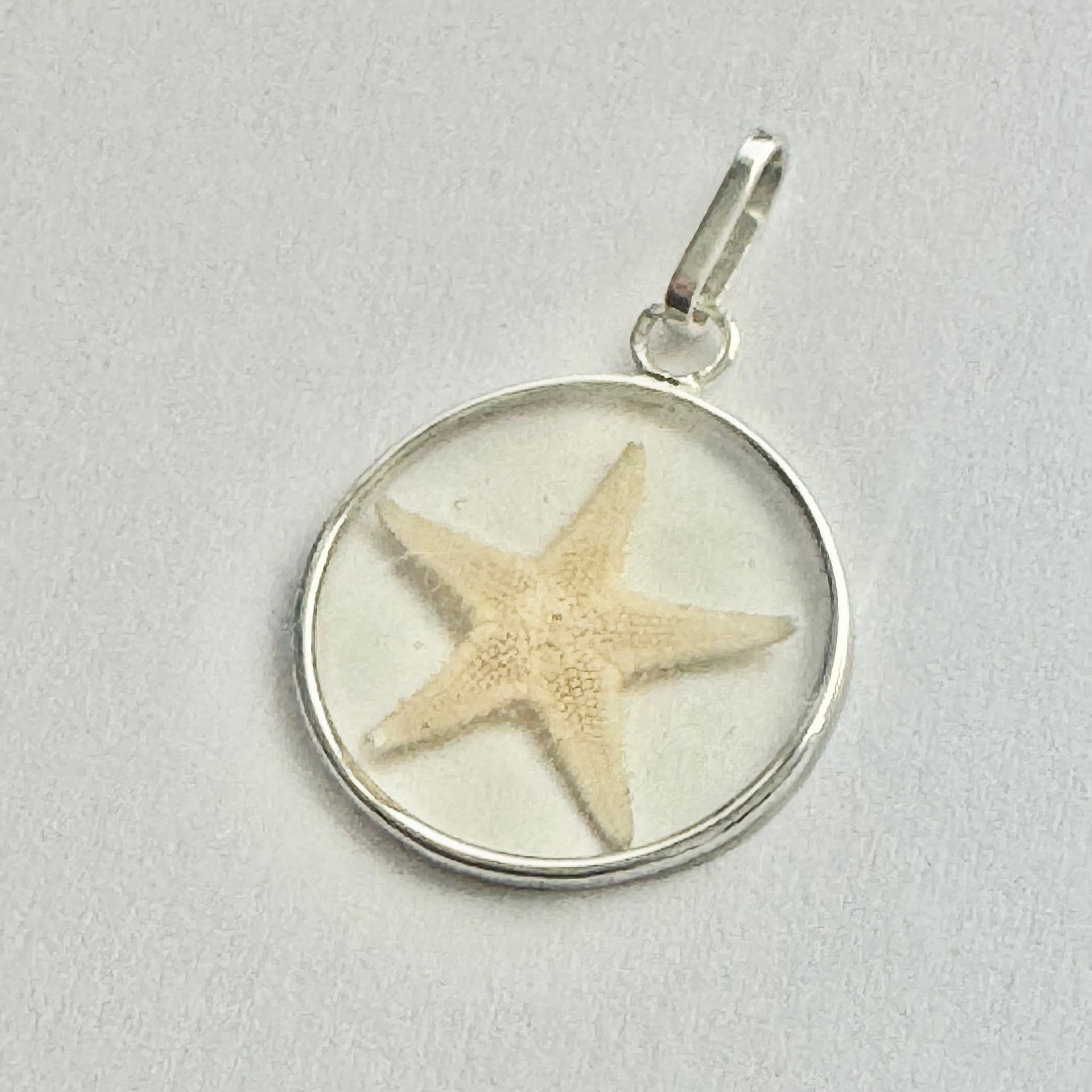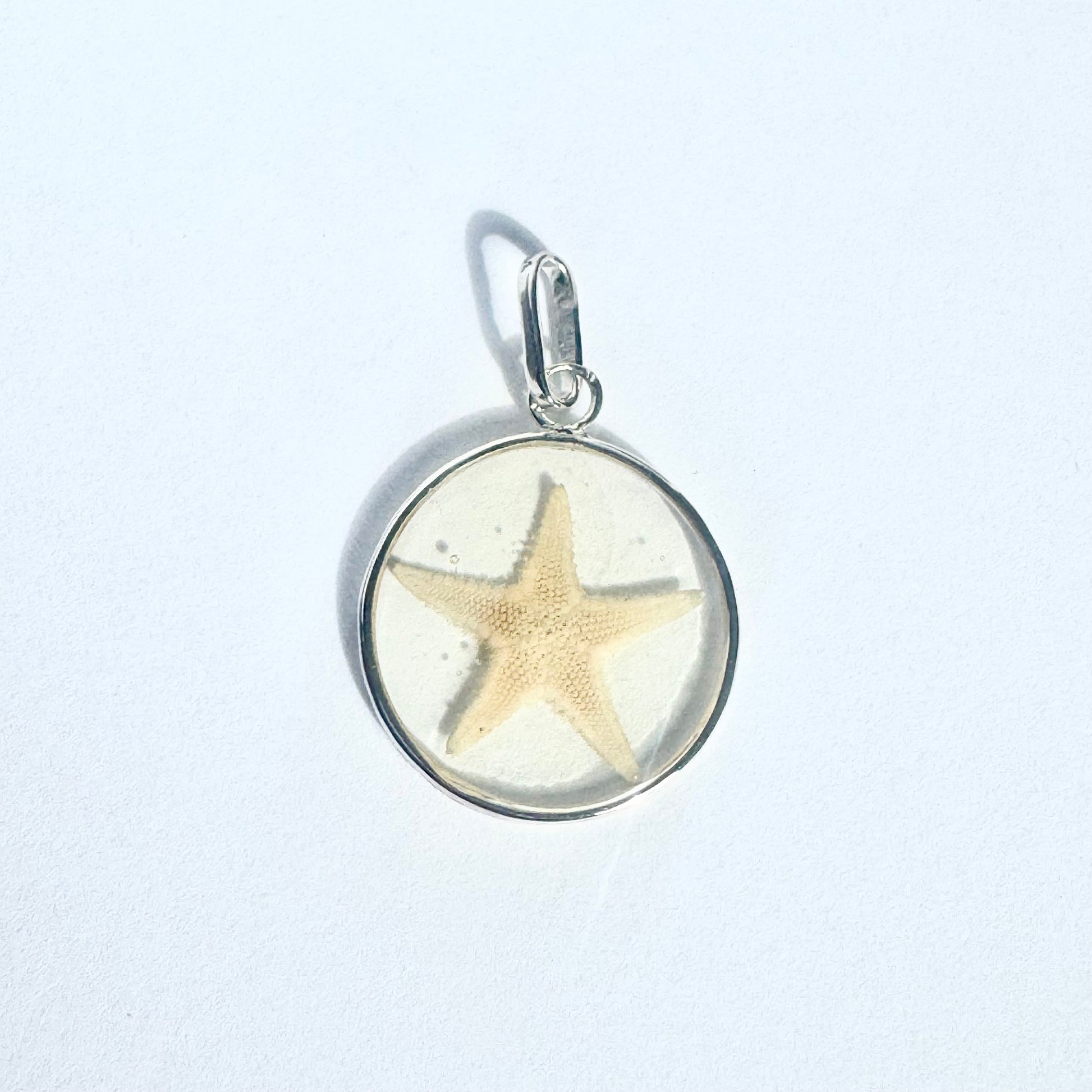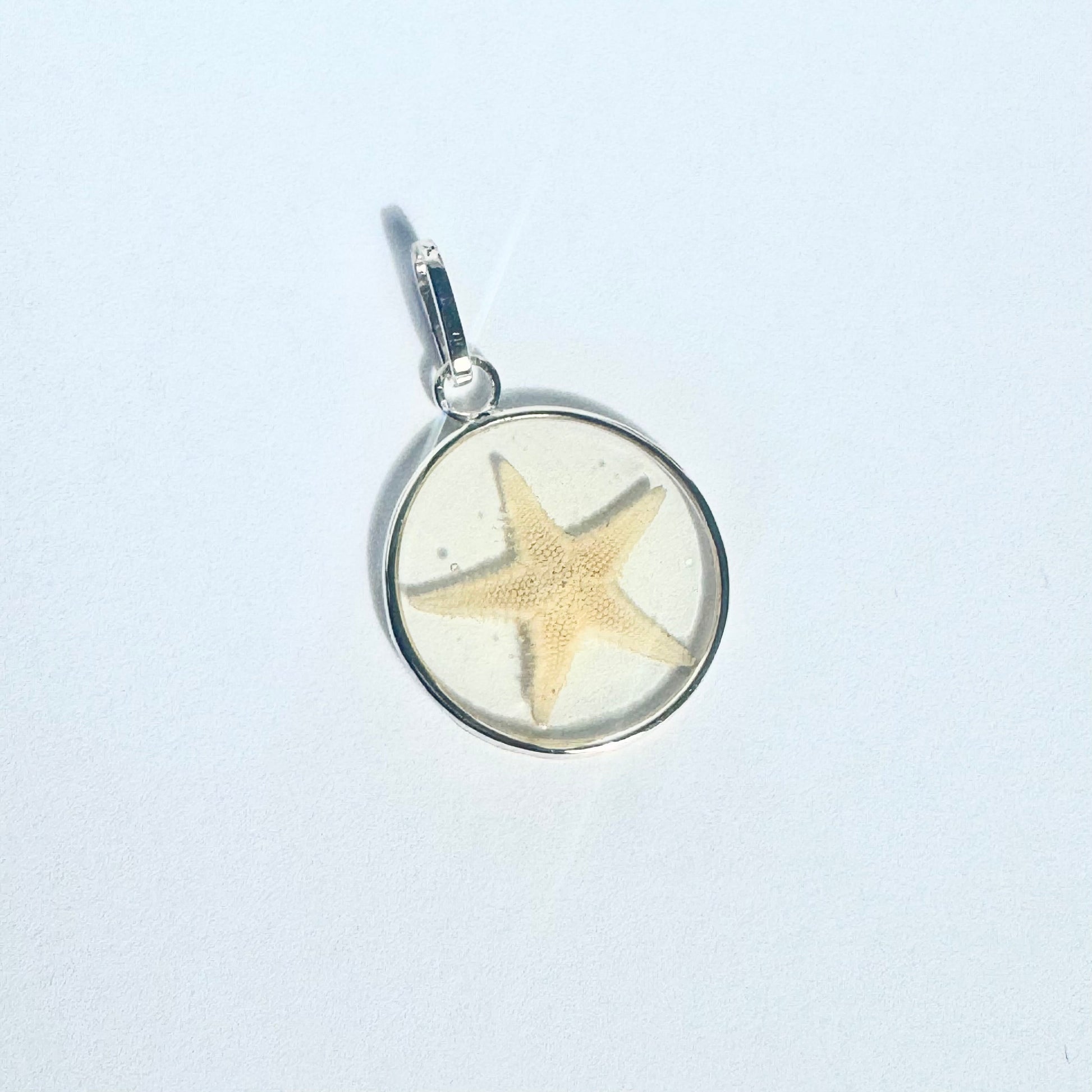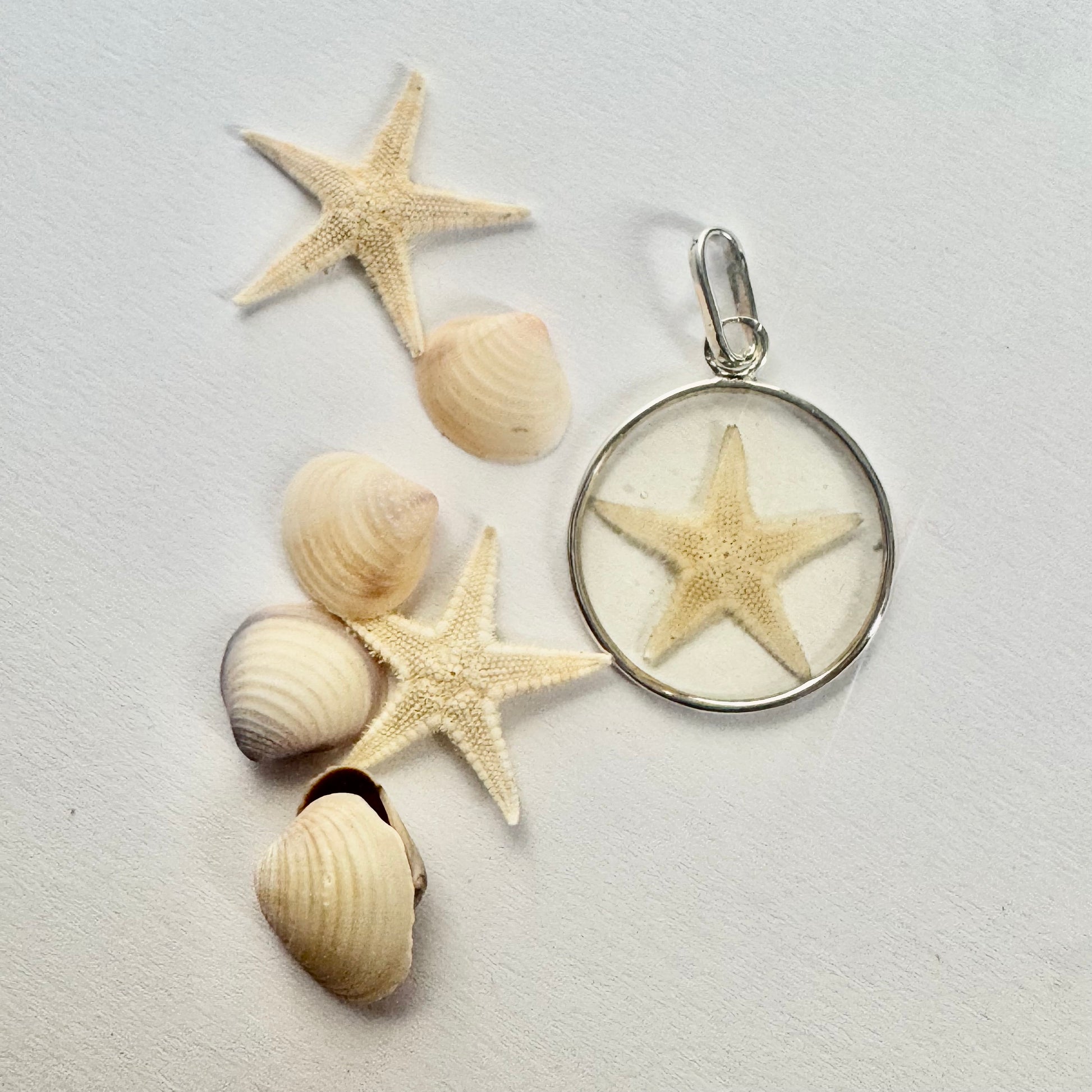 Ce pendentif unique renferme une véritable petite étoile de mer séchée, préservée avec soin dans un gel UV transparent qui met en valeur ses détails naturels et sa délicate teinte.