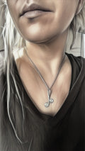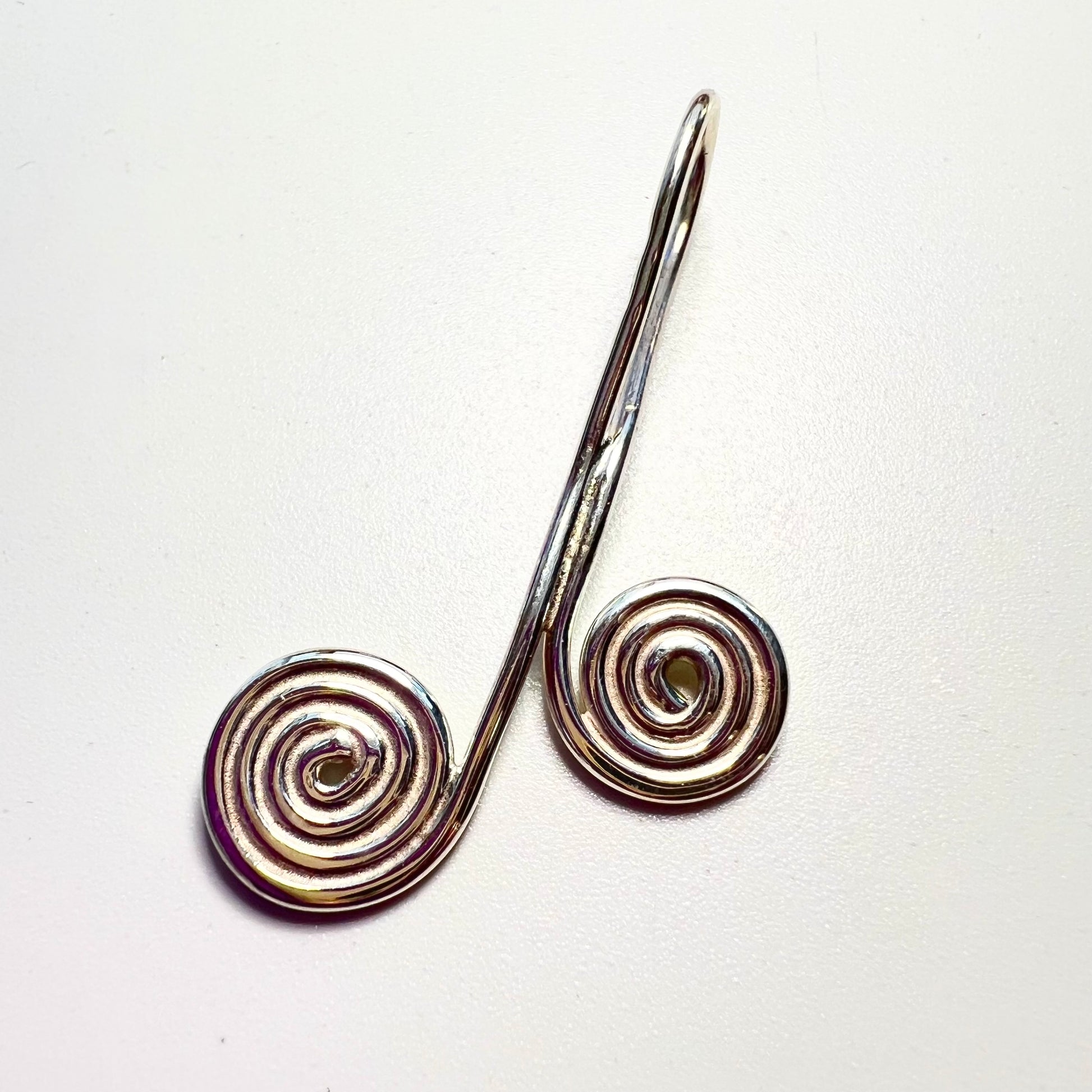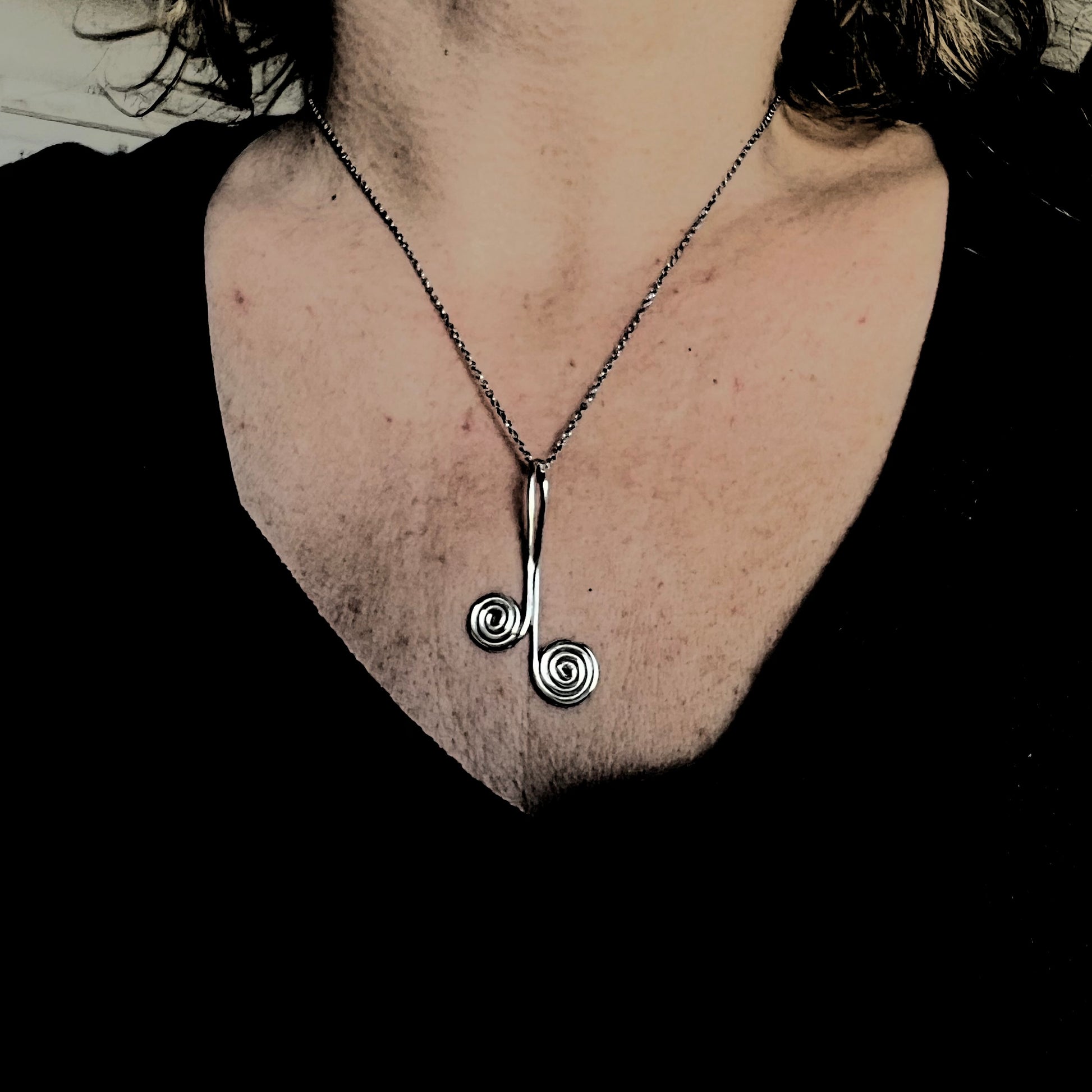 Ce pendentif unique révèle deux spirales en argent 925, entièrement façonnées à la main.
