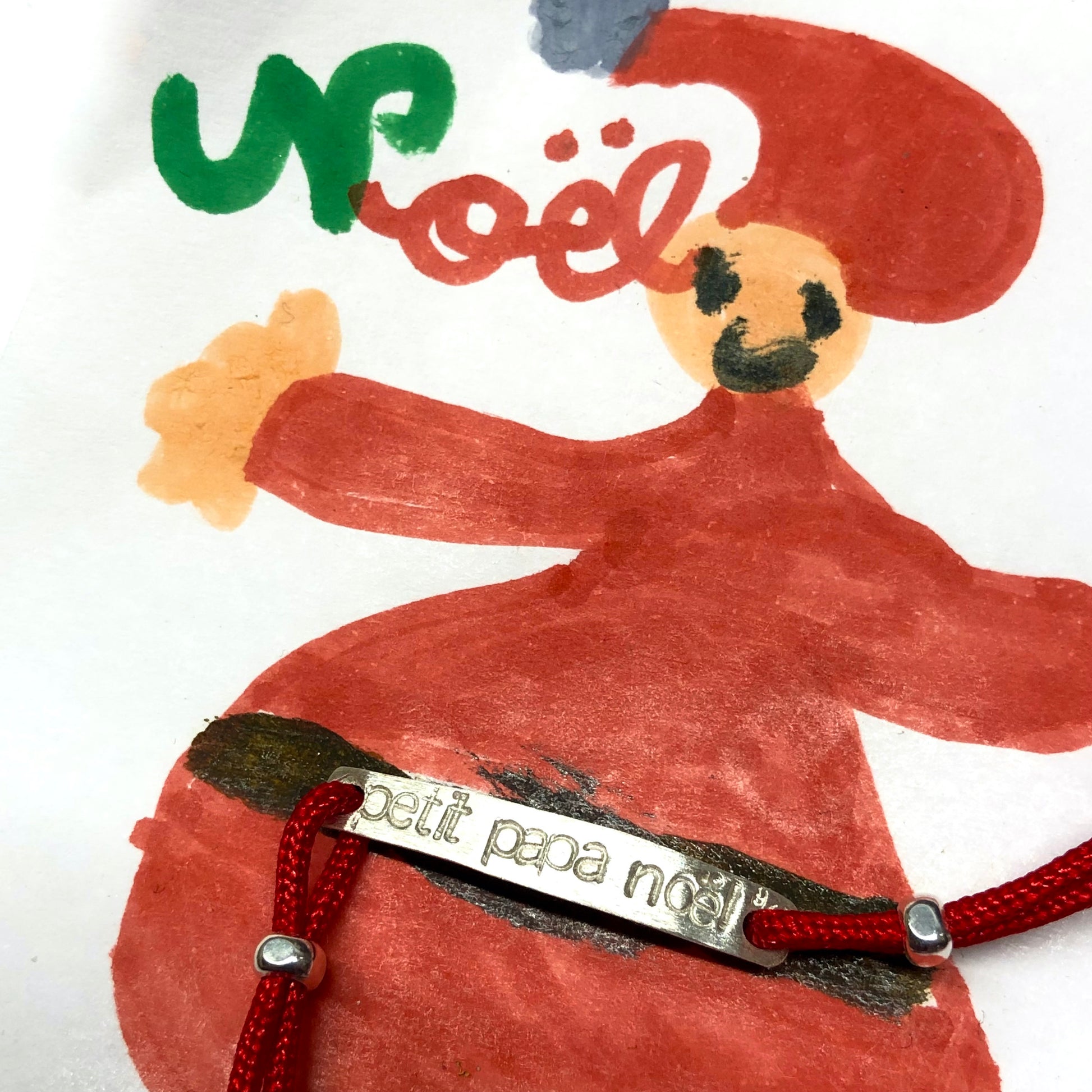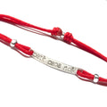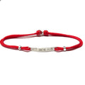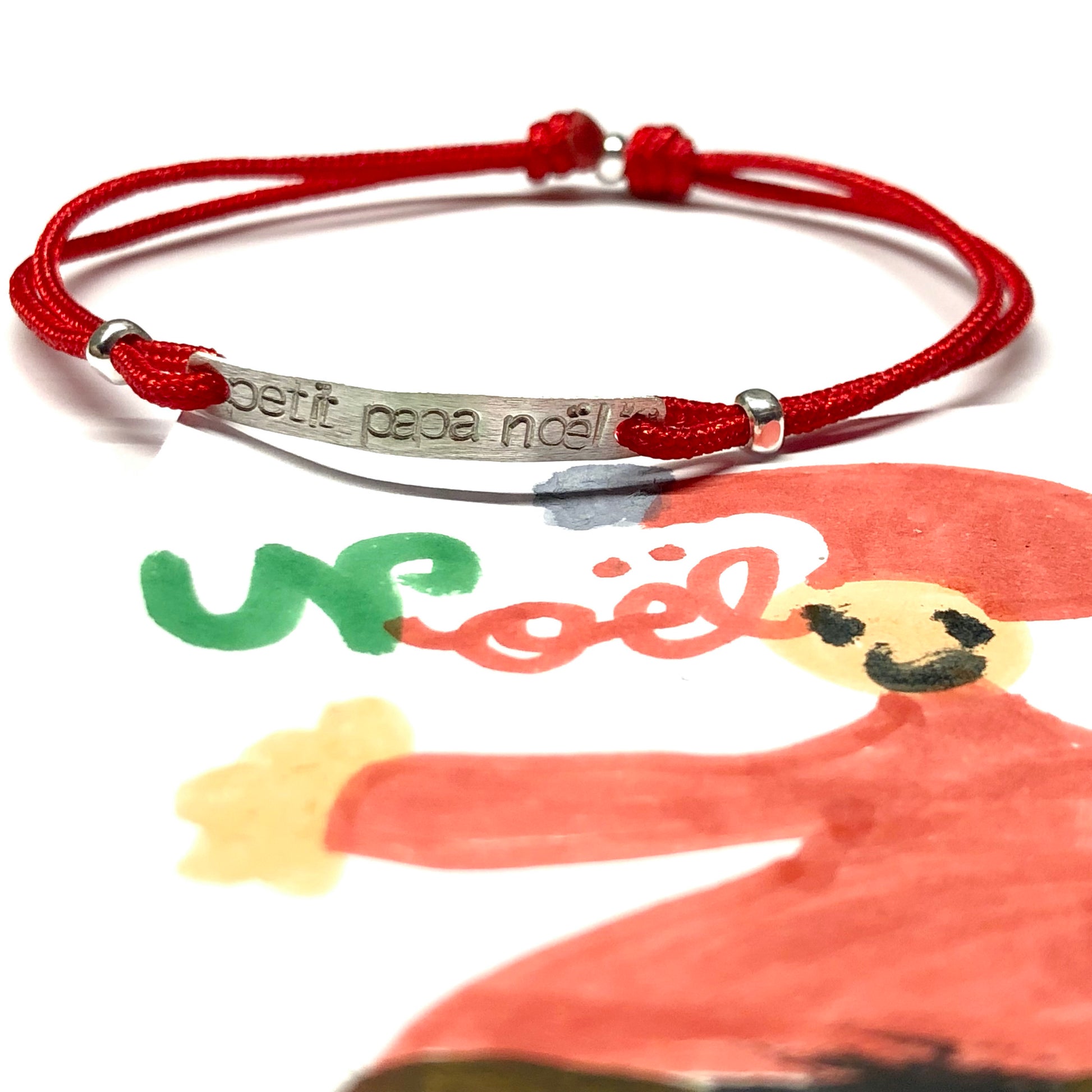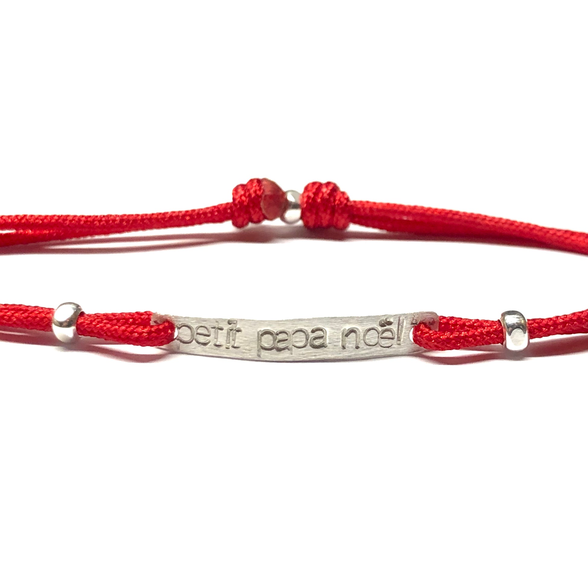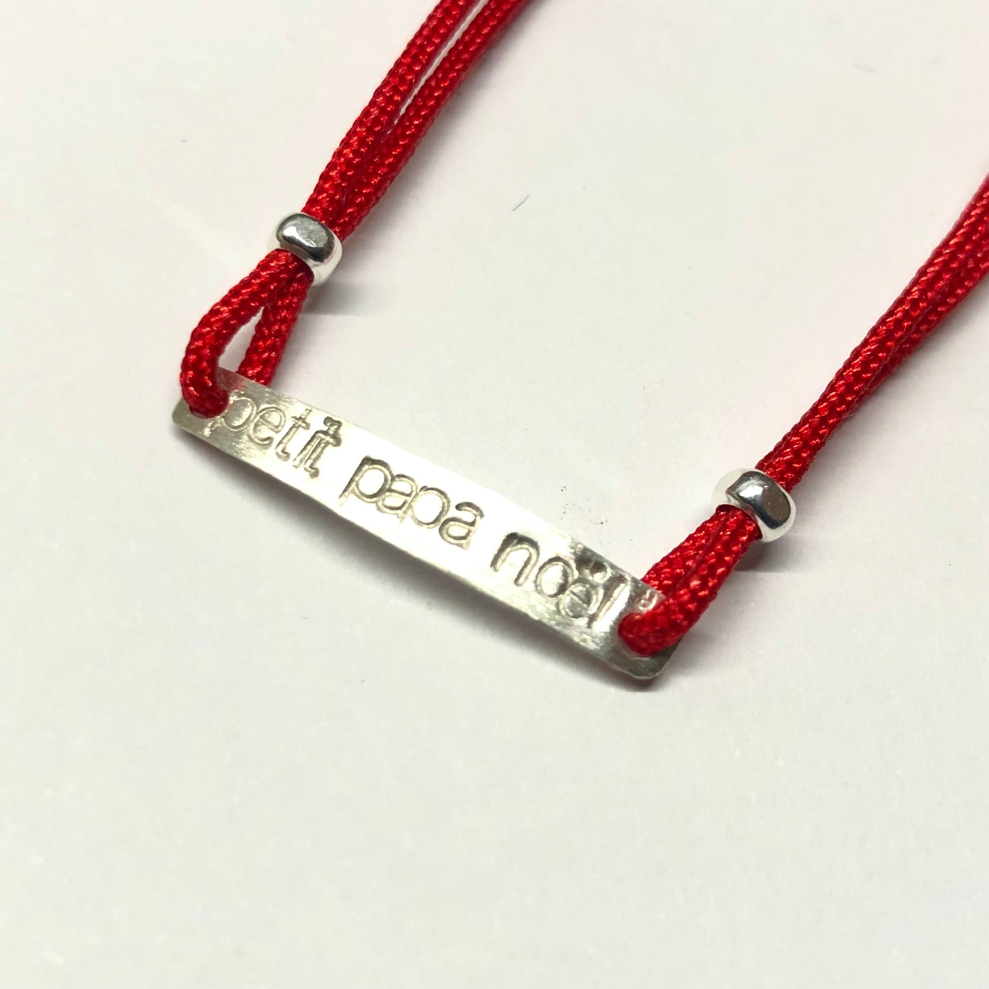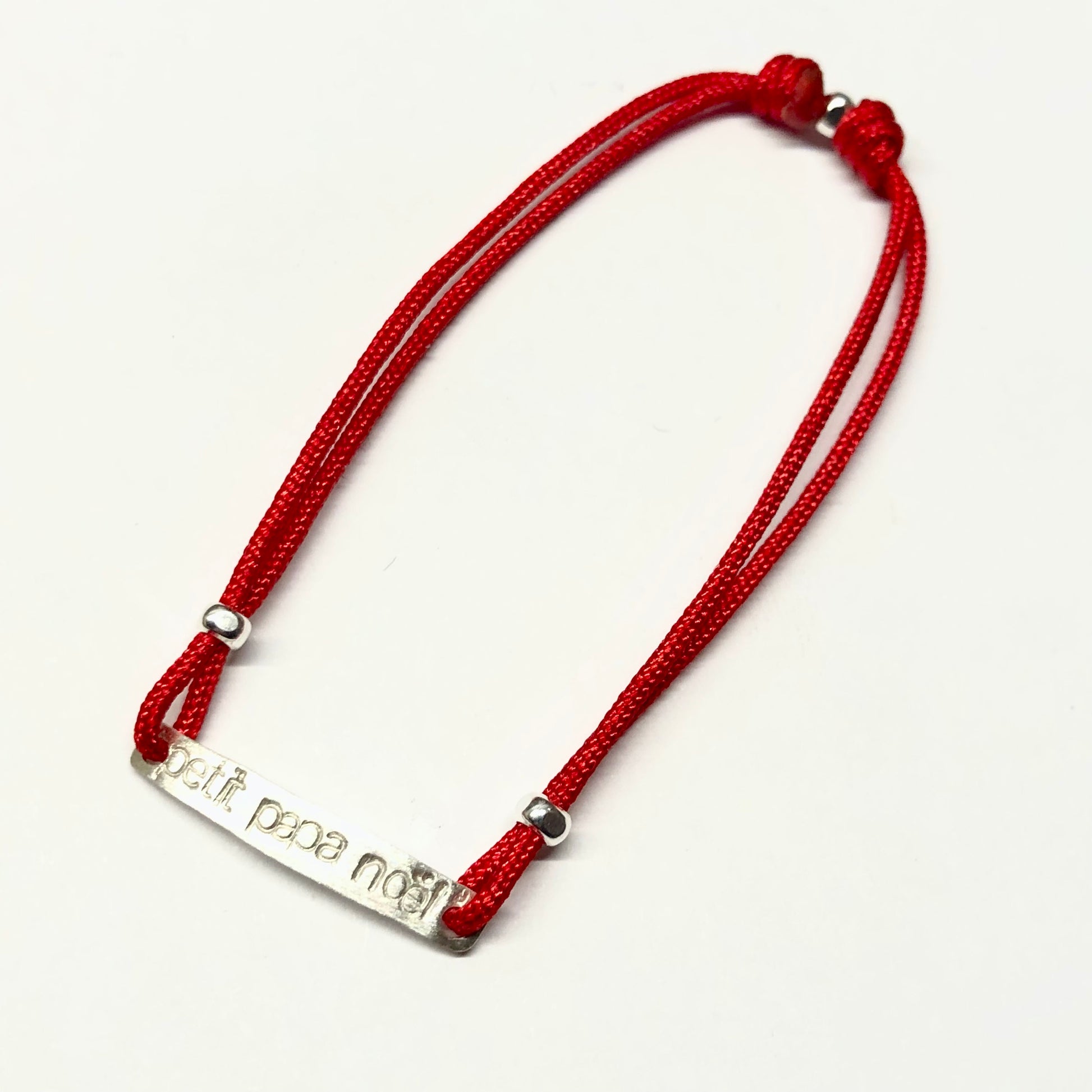 Bracelet en argent massif 925, composé d’une plaque frapée du titre de la chanson, monté sur un cordon nylon rouge avec trois boules de 3mm. en argent 925.
