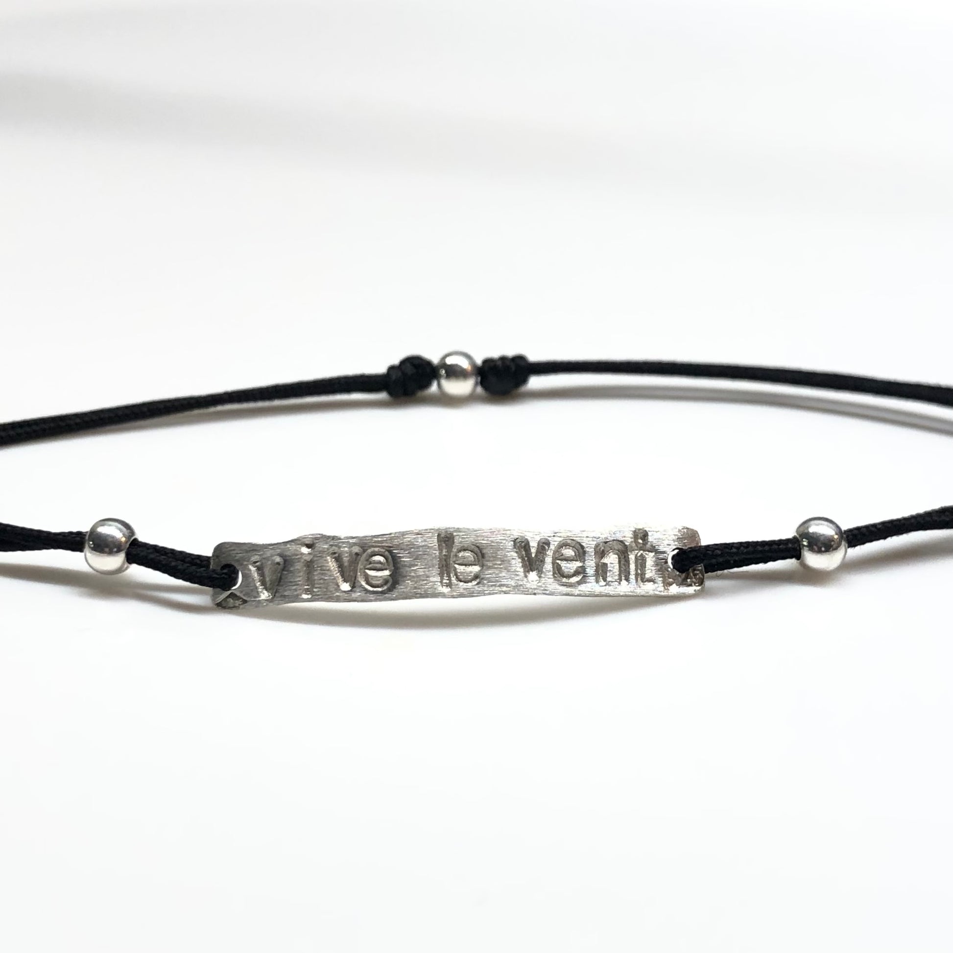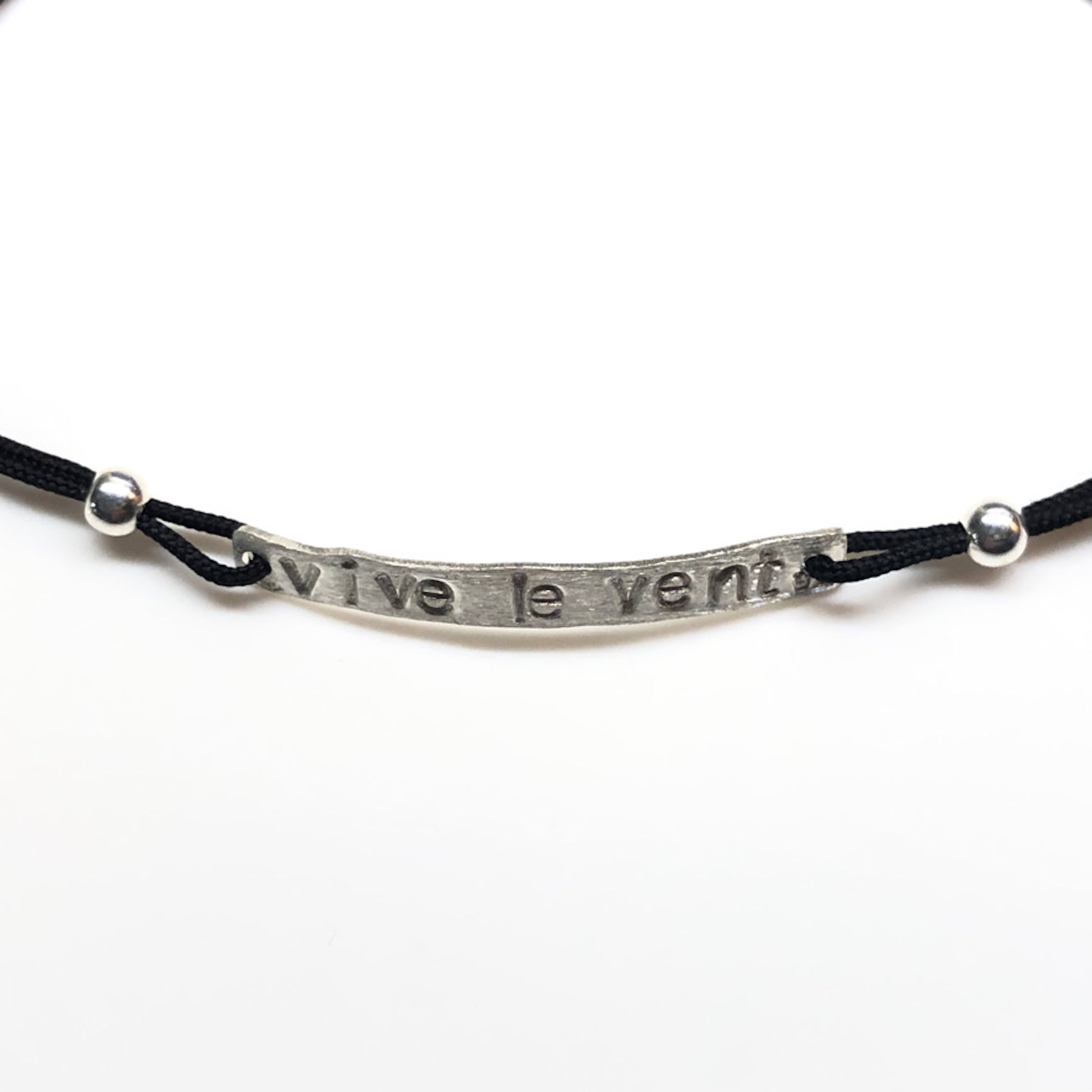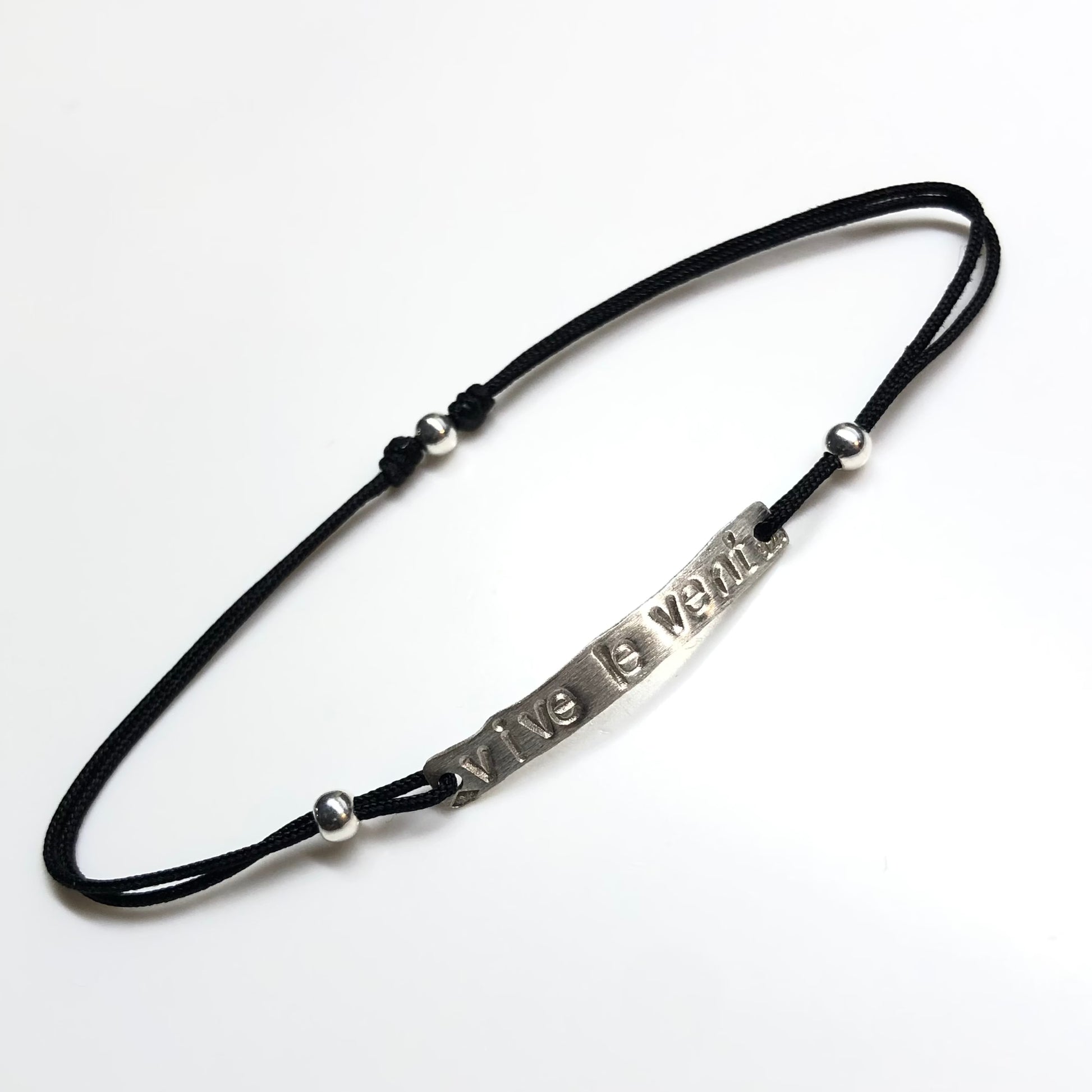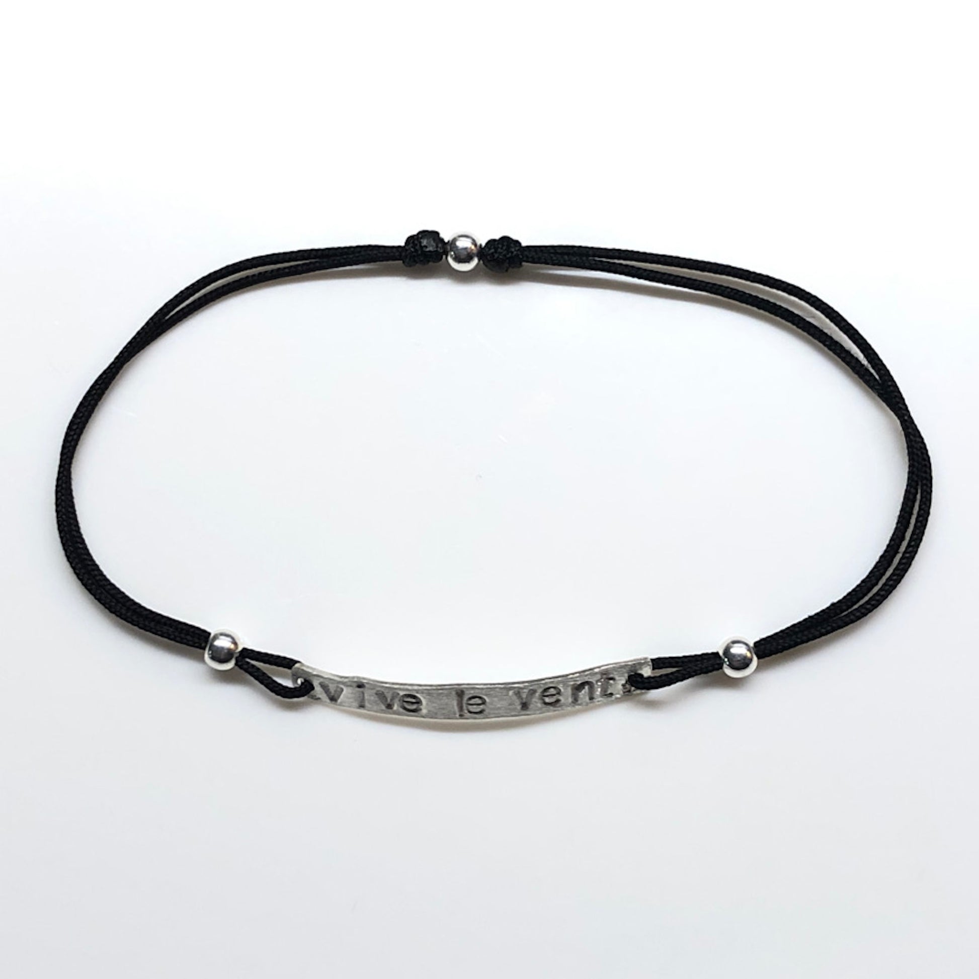 Bracelet en argent massif 925, composé d’une plaque frapée du titre de la chanson, monté sur un cordon nylon noir avec trois boules de 3mm. en argent 925.
