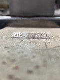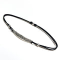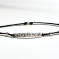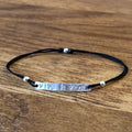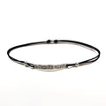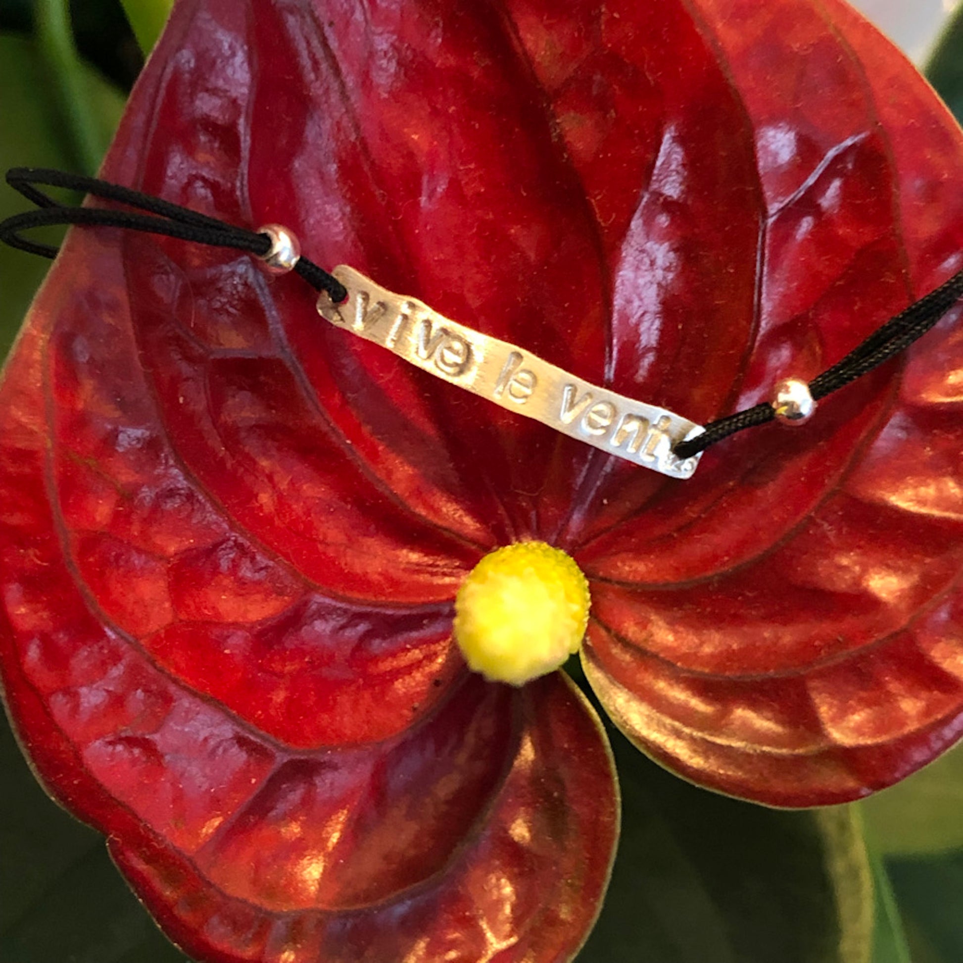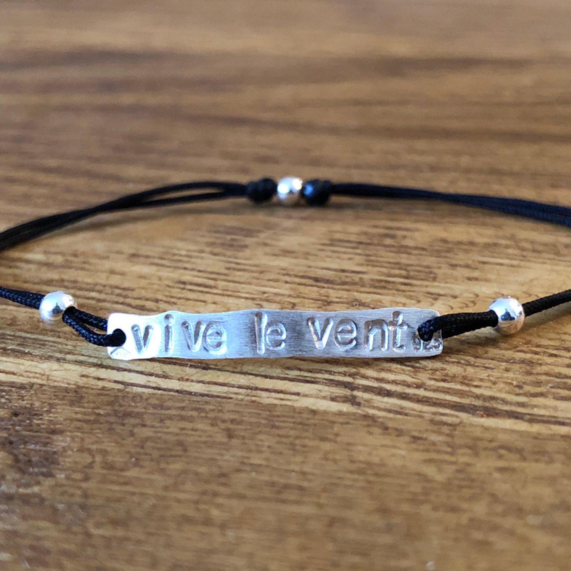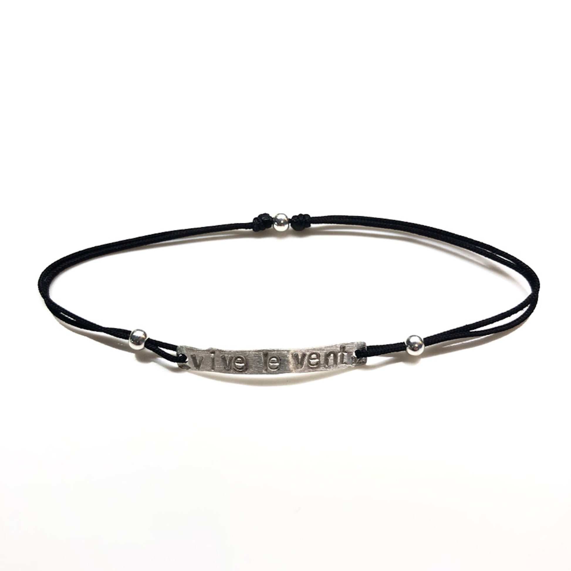 Bracelet en argent massif 925, composé d’une plaque frapée du titre de la chanson, monté sur un cordon nylon noir avec trois boules de 3mm. en argent 925.