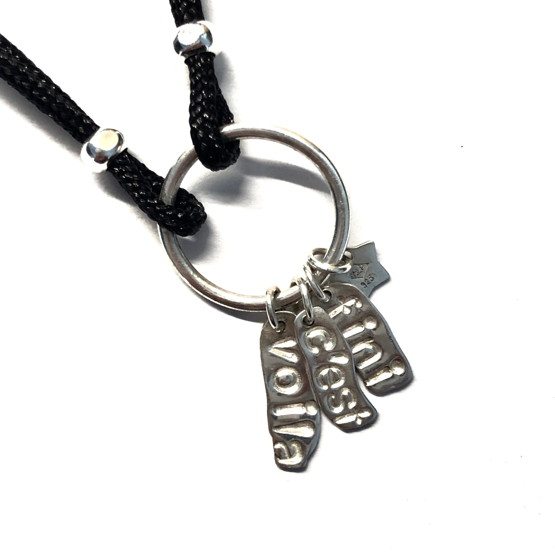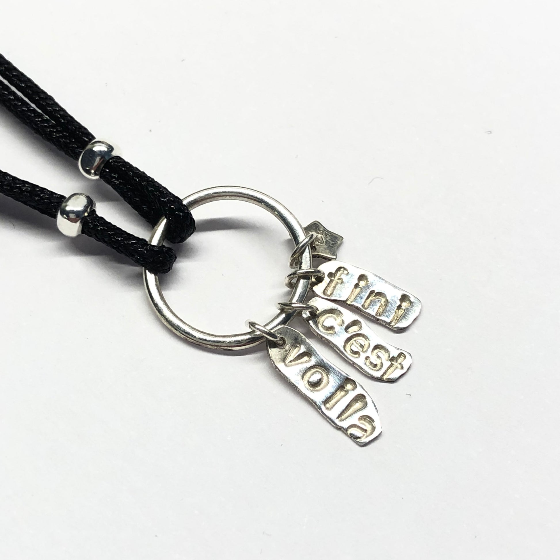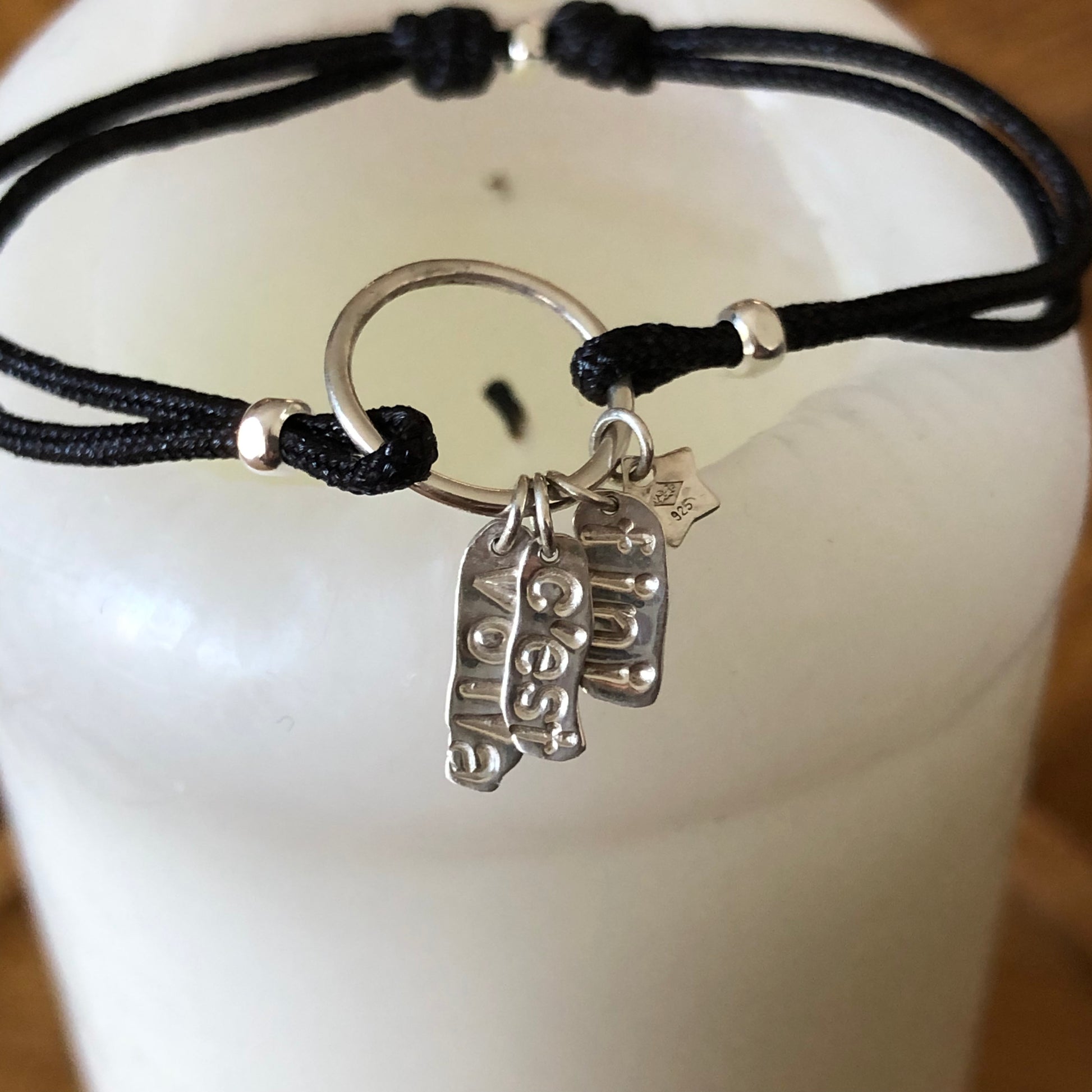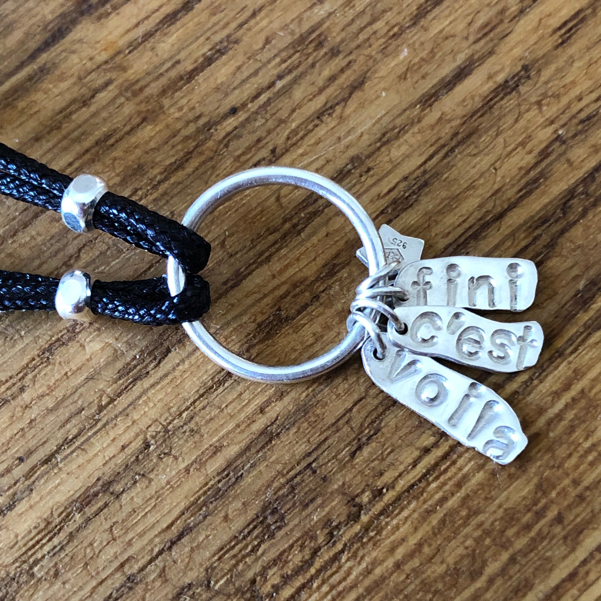 Ce bracelet unique associe simplicité et émotion. Chaque pampille en argent massif 925 est frappée à la main des mots qui composent le titre, rendant chaque pièce singulière et profondément personnelle.